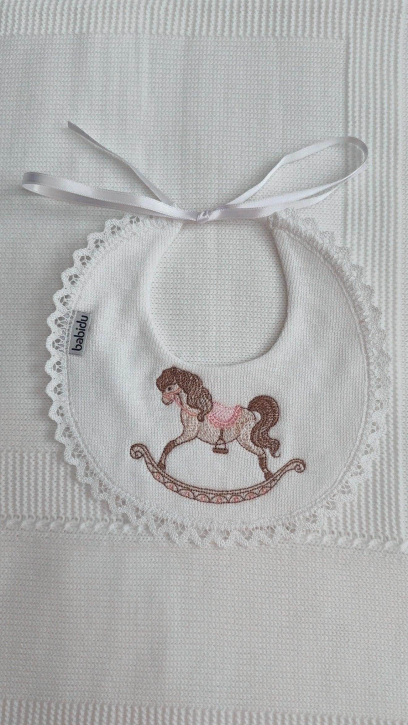 Add a touch of luxury to your little one’s outfit with our beautifully embroidered blue rocking horse bib. Designed with practicality and elegance in mind, this bib is made from soft, breathable cotton — gentle on delicate skin while keeping your baby clean and comfortable. The lace trim and satin ribbon tie make it perfect for both everyday wear and special occasions.