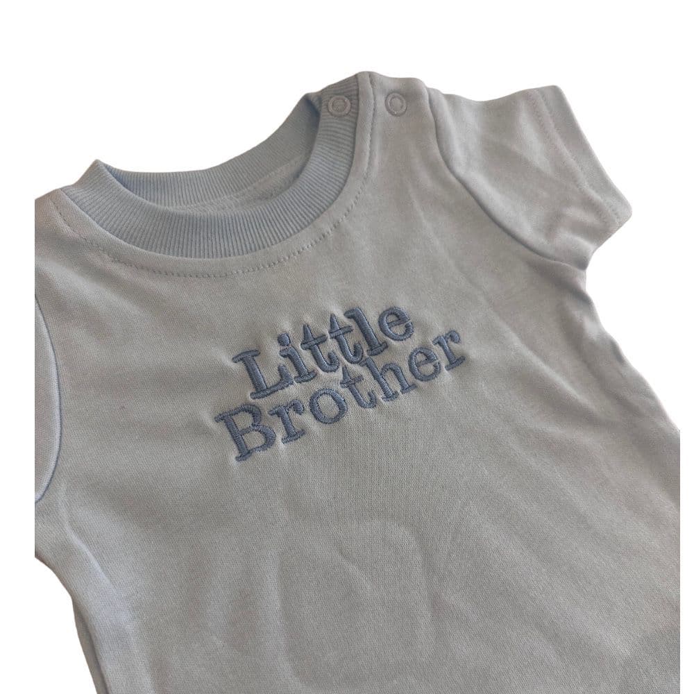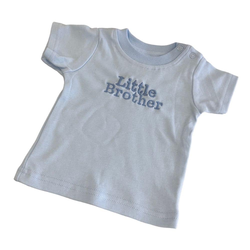 A blue t-shirt embroidered with 'Little Brother'.