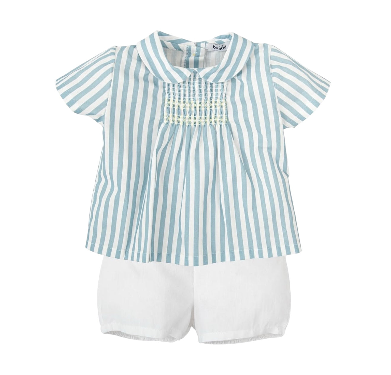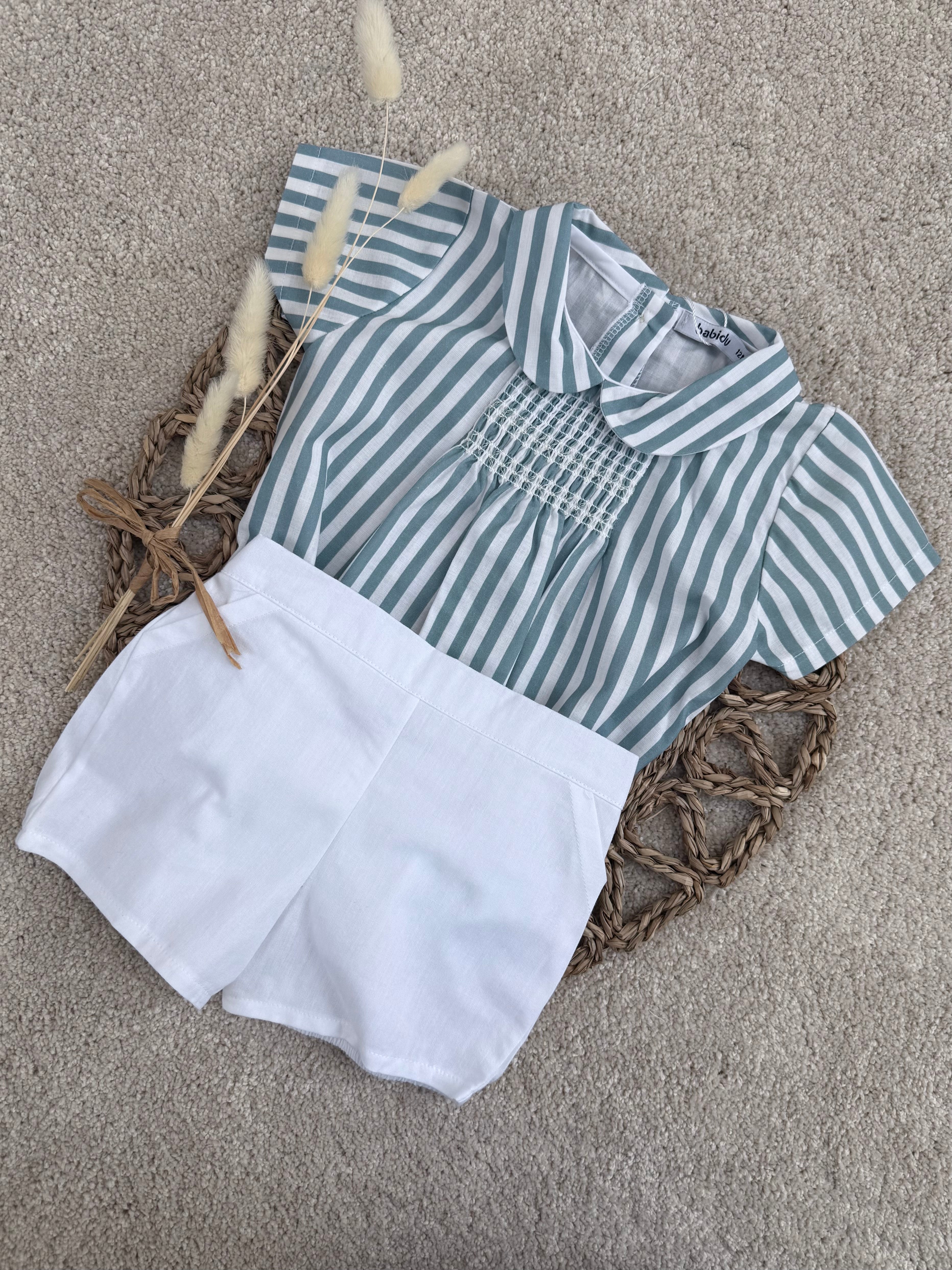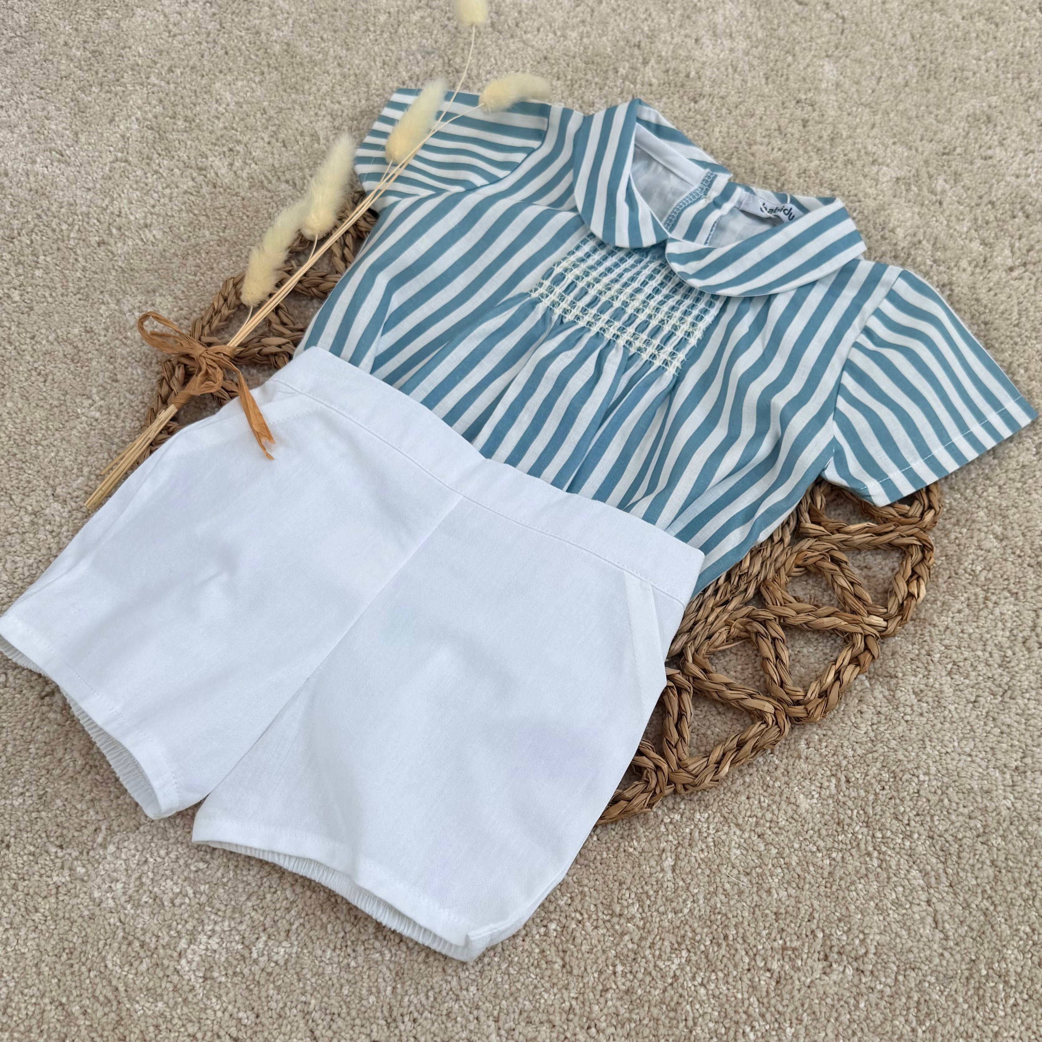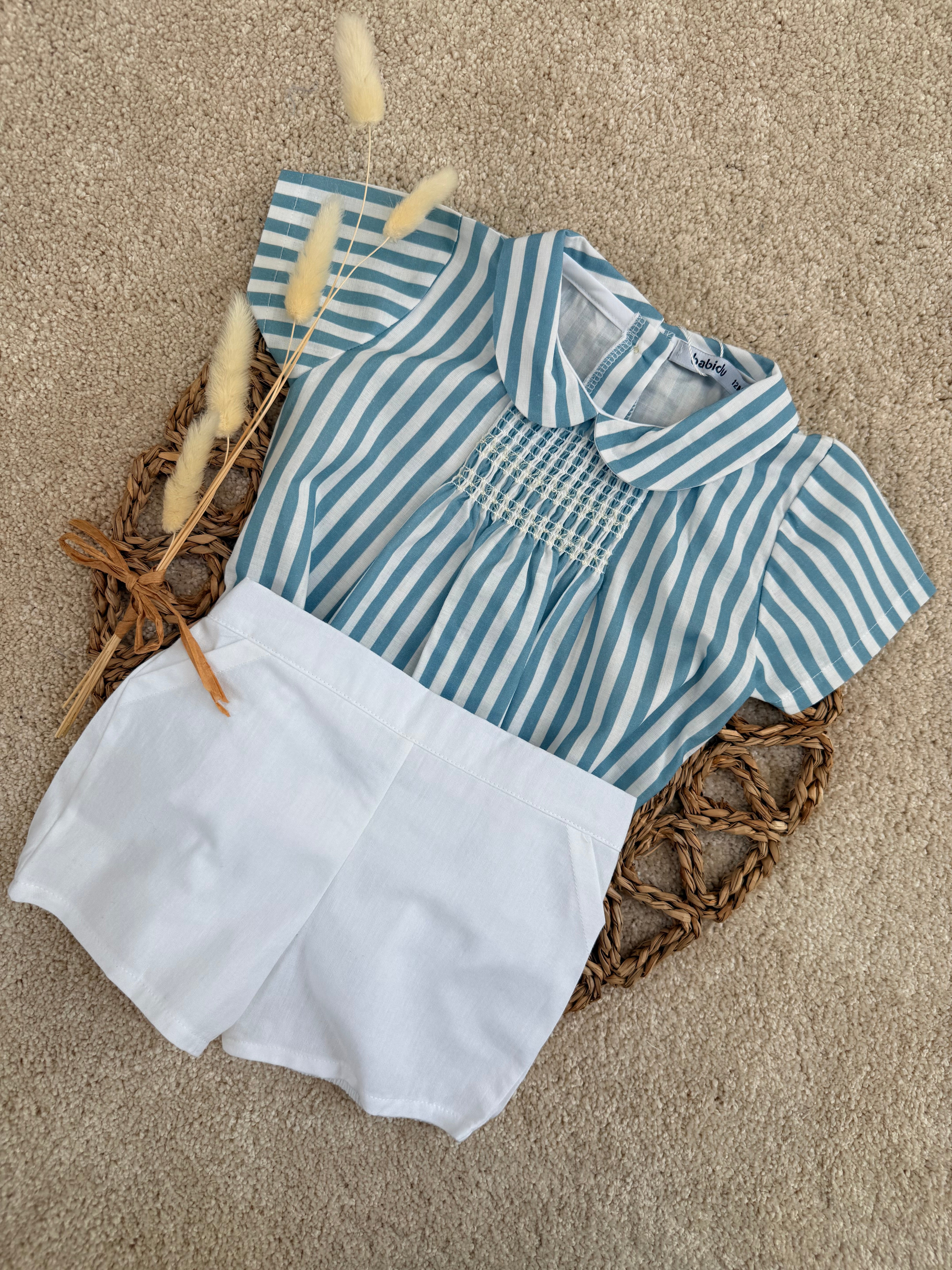 Blue and white stripe cotton shorts set for boys by Babidu. Comfortable to wear, the top is made from cotton. It has a up button back and short sleeves, The lightweight, pull-on shorts have slanted front pockets and a gently elasticated waist.