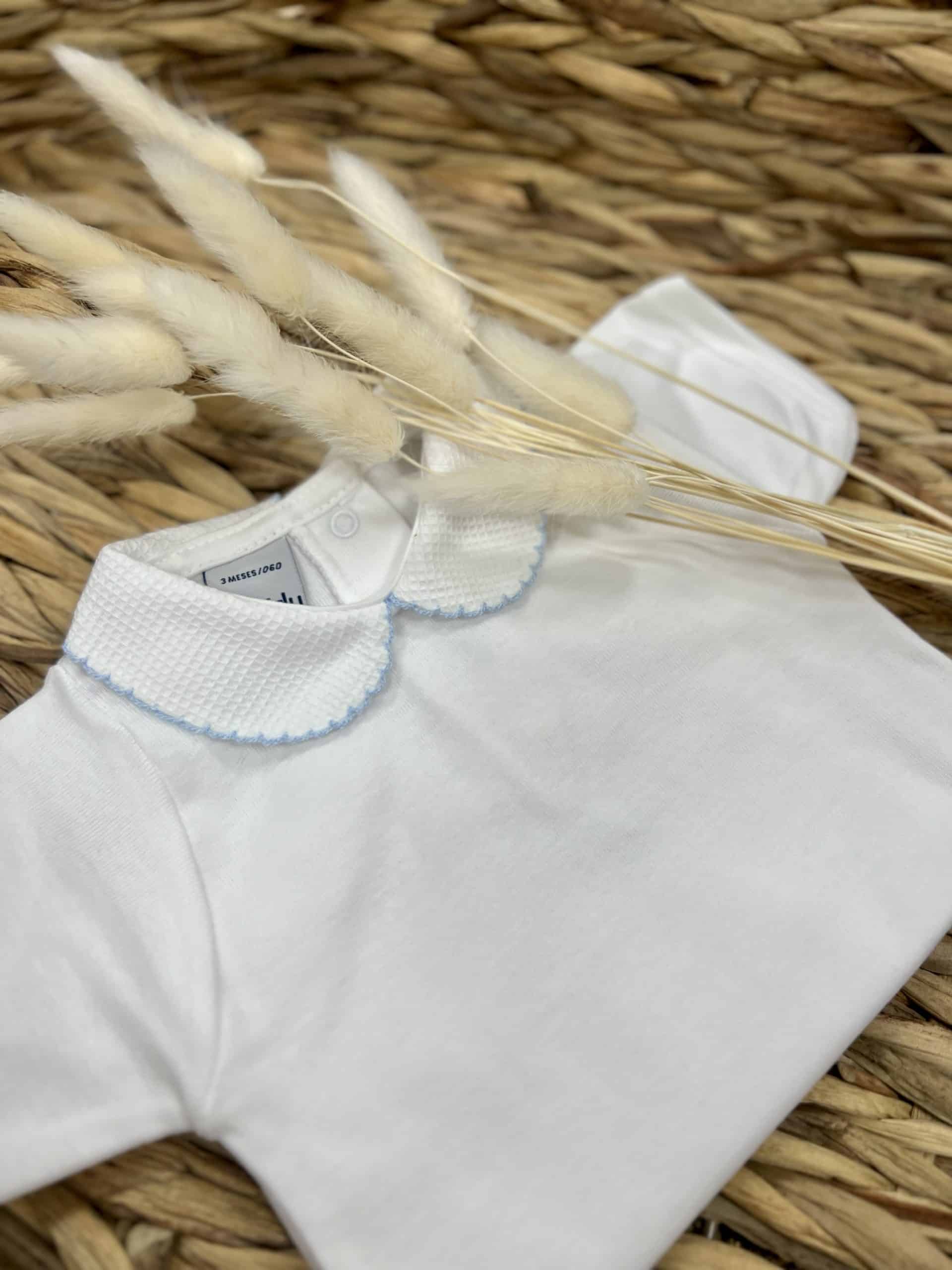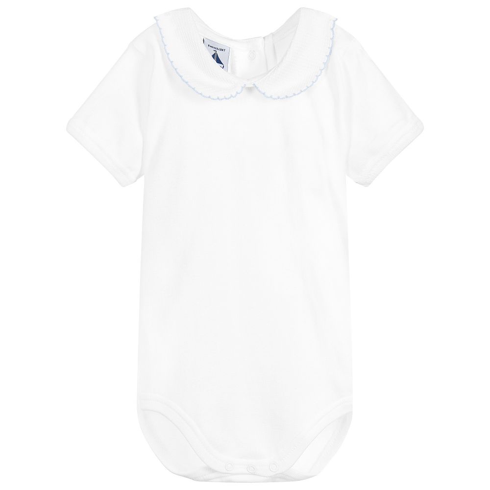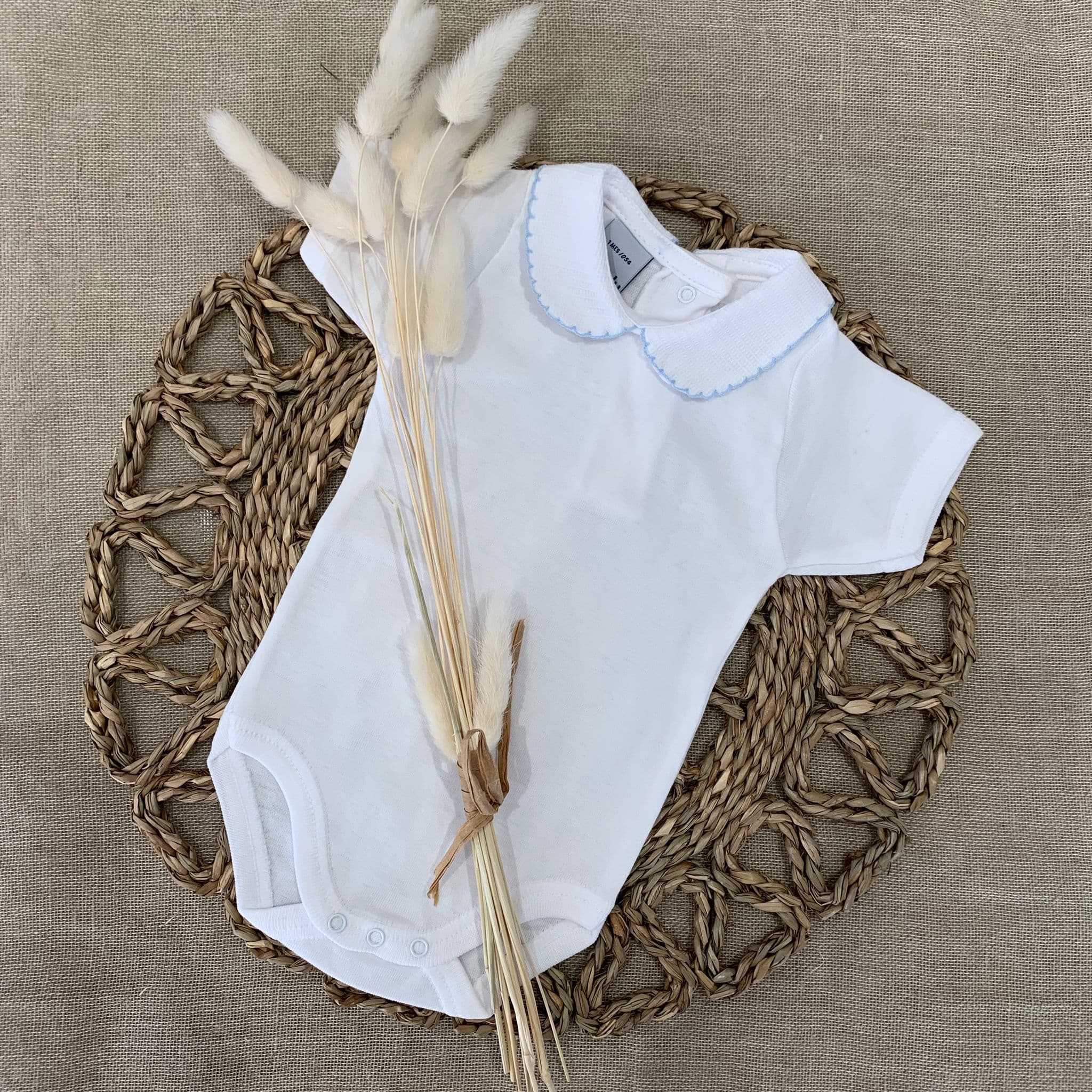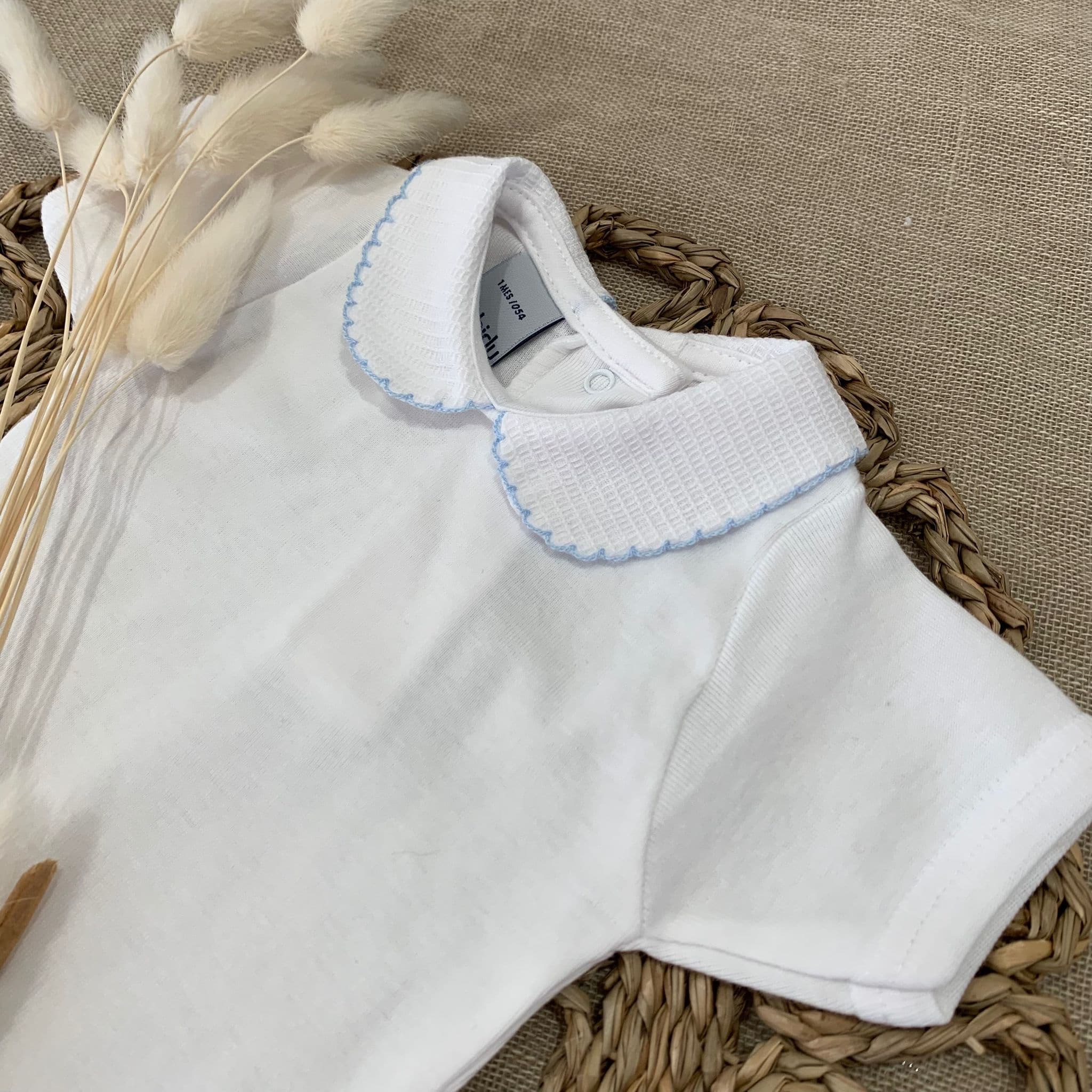 Little boys short-sleeved bodysuit by Babidu, made in soft cotton jersey. It has a rounded collar in a textured cotton fabric with a scalloped Blue edging. There are popper fastenings at the legs for easy dressing and changing. It is suitable for both boys and girls.