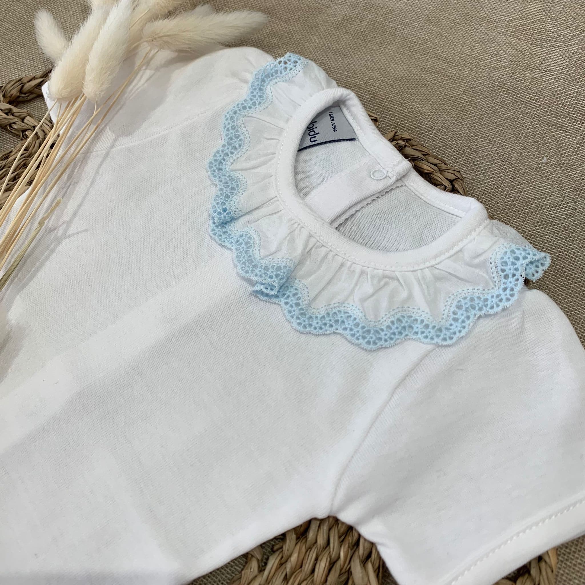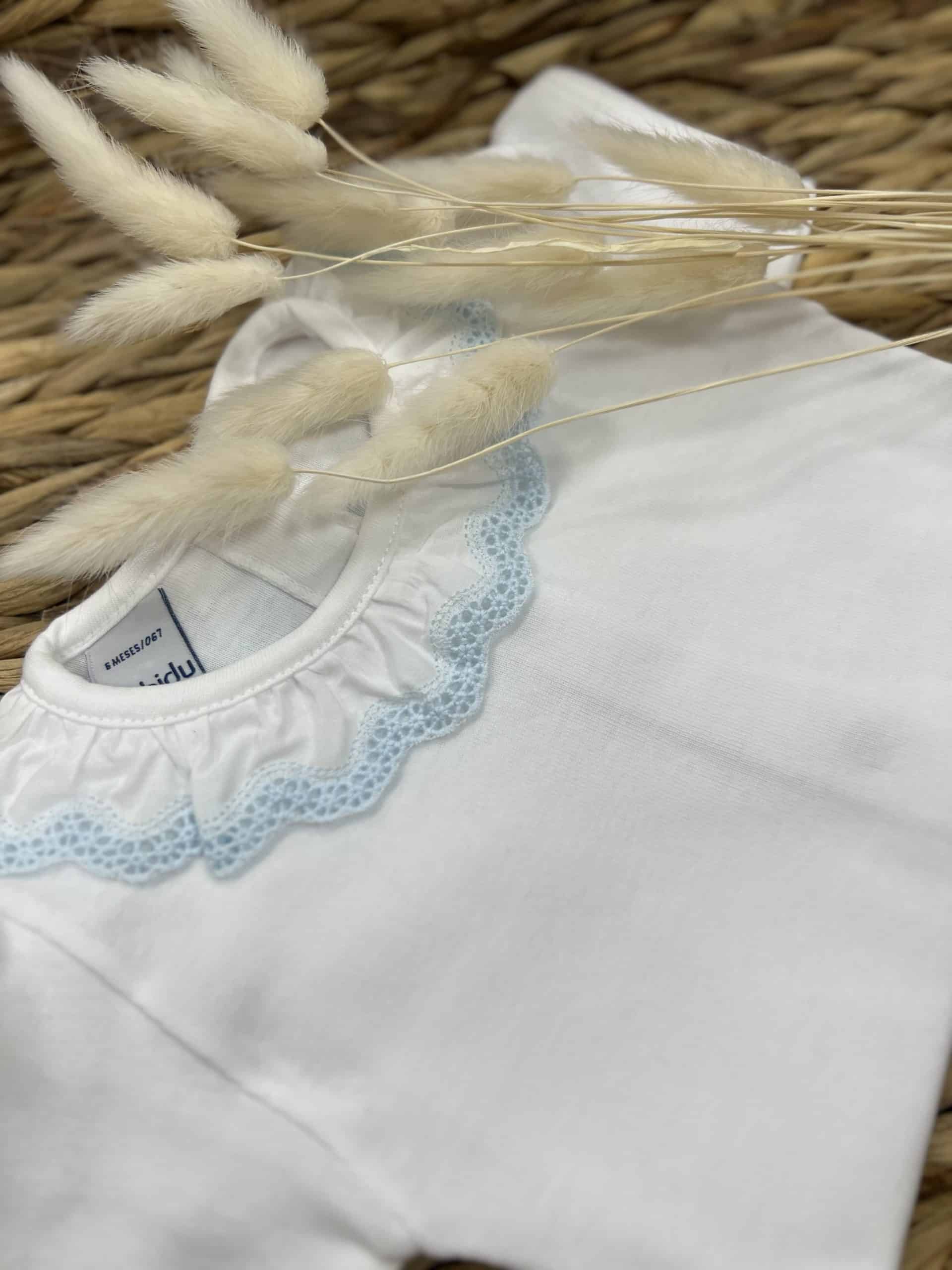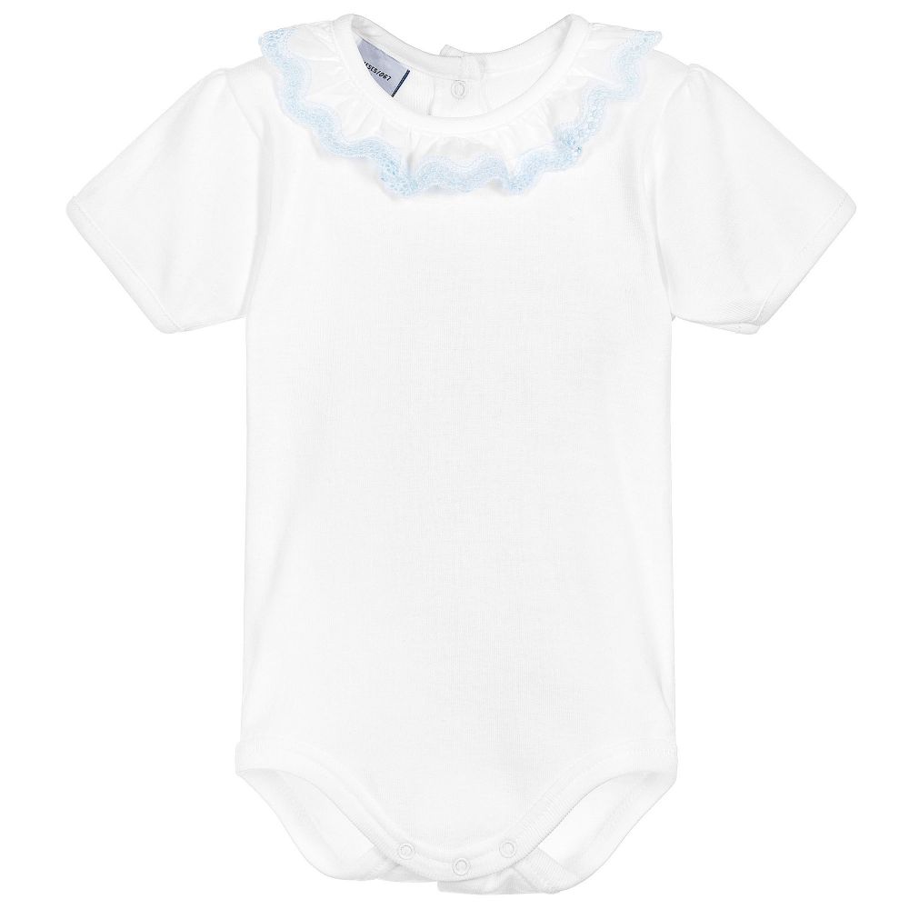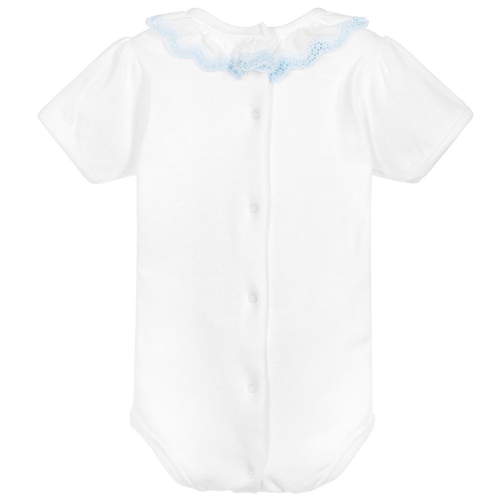 White short-sleeved bodysuit by Babidu, made in soft, stretchy cotton jersey, suitable for both baby boys and girls. It has a smooth cotton, ruffle collar with sweet blue lace trim. This versatile babysuit can be worn both as a bodyvest or a top, never becoming untucked.