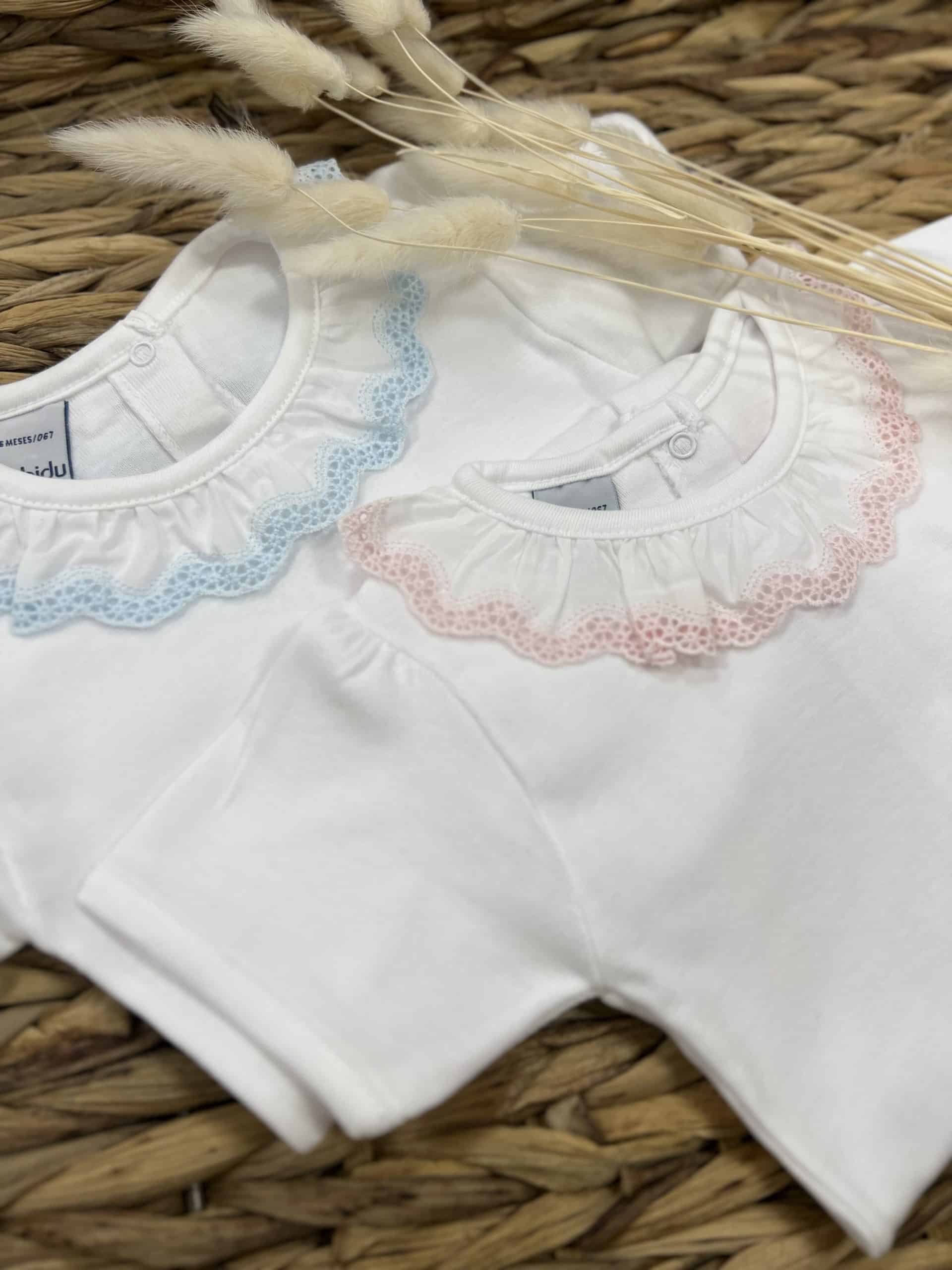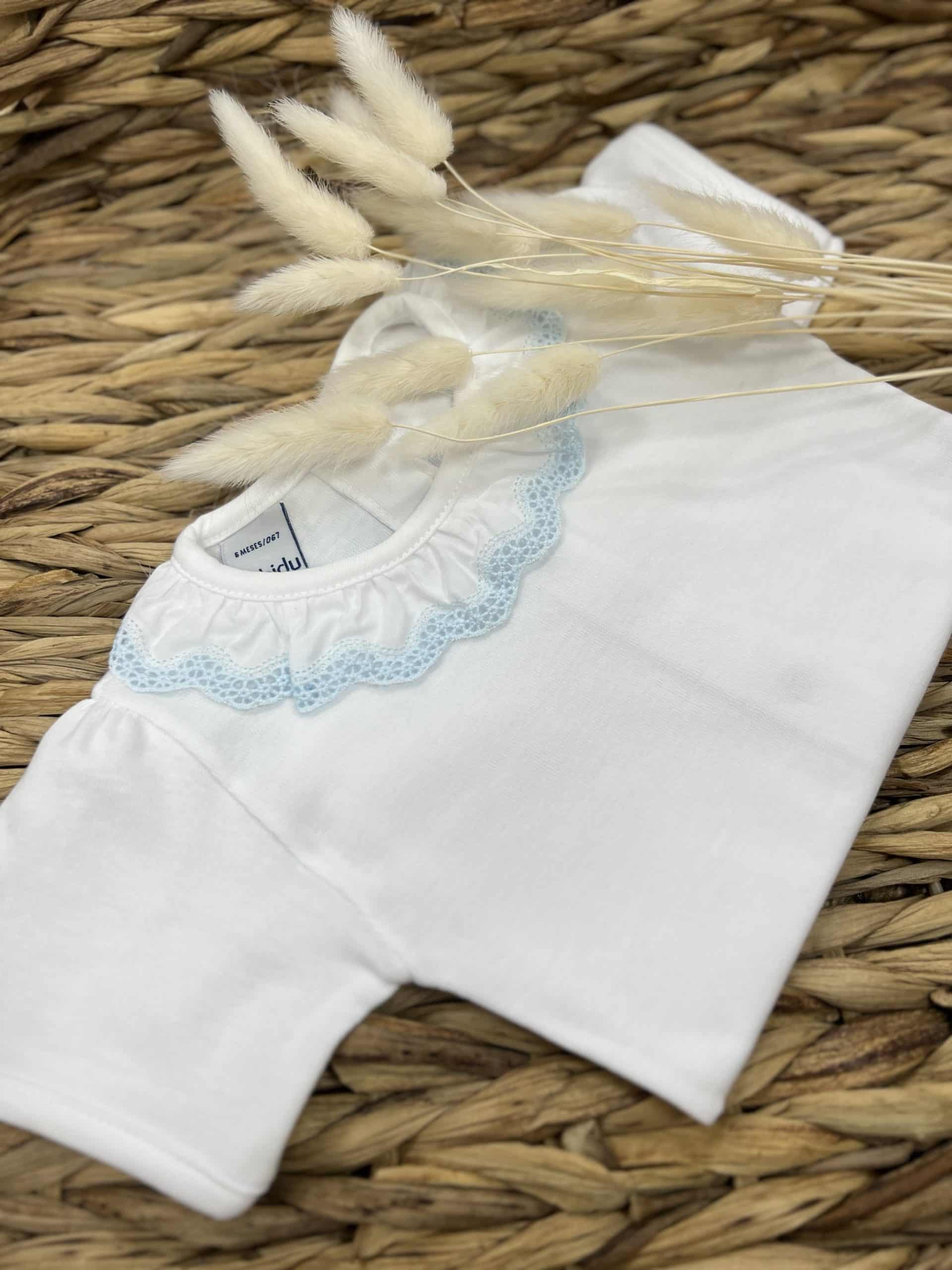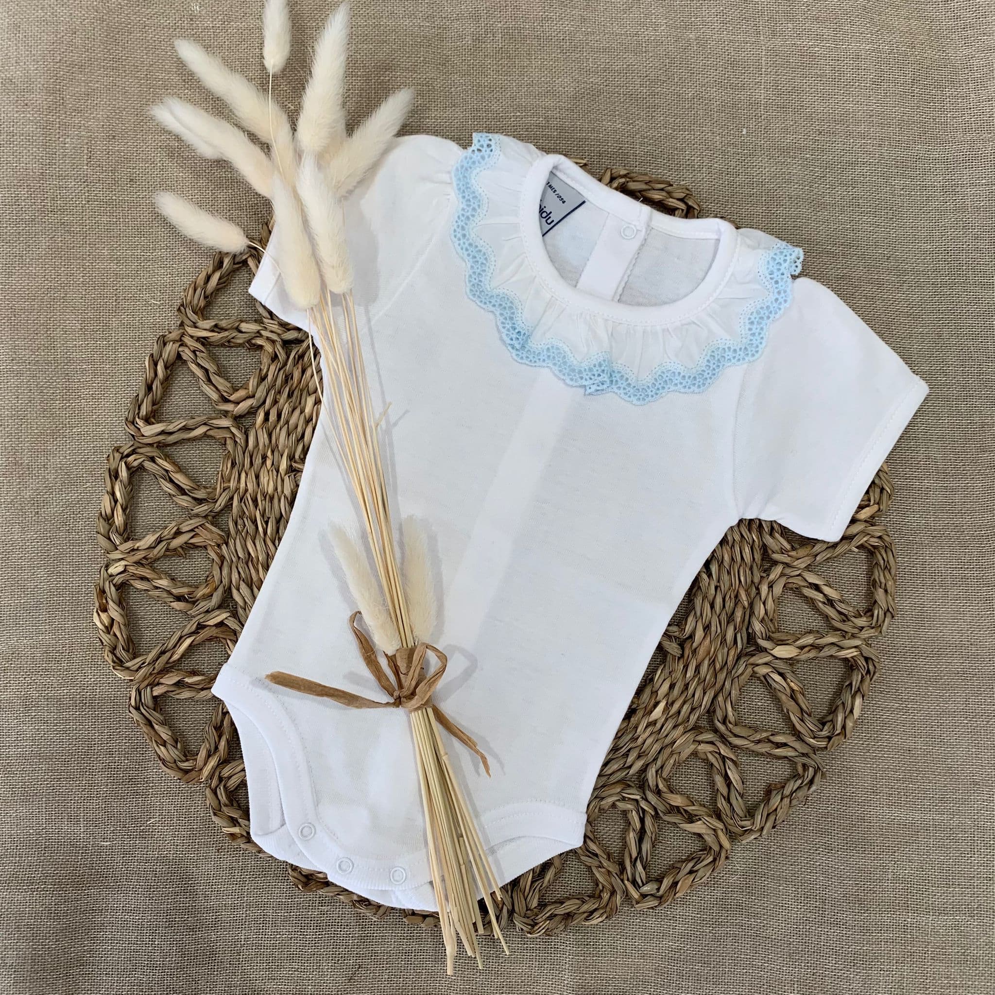 White short-sleeved bodysuit by Babidu, made in soft, stretchy cotton jersey, suitable for both baby boys and girls. It has a smooth cotton, ruffle collar with sweet blue lace trim. This versatile babysuit can be worn both as a bodyvest or a top, never becoming untucked.