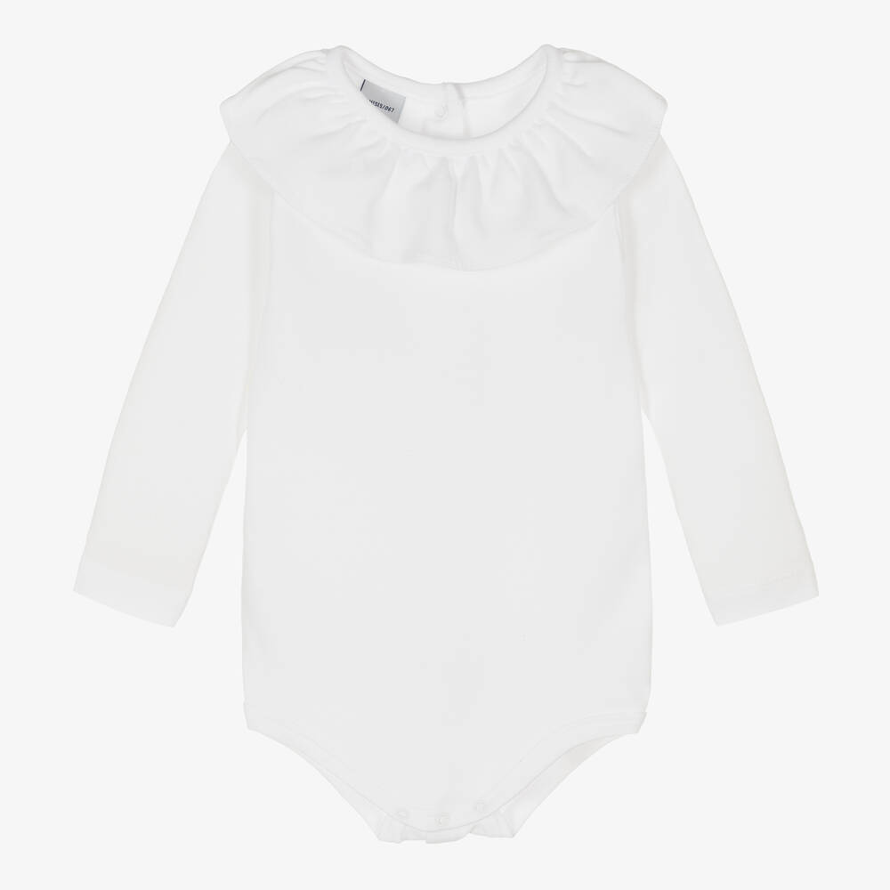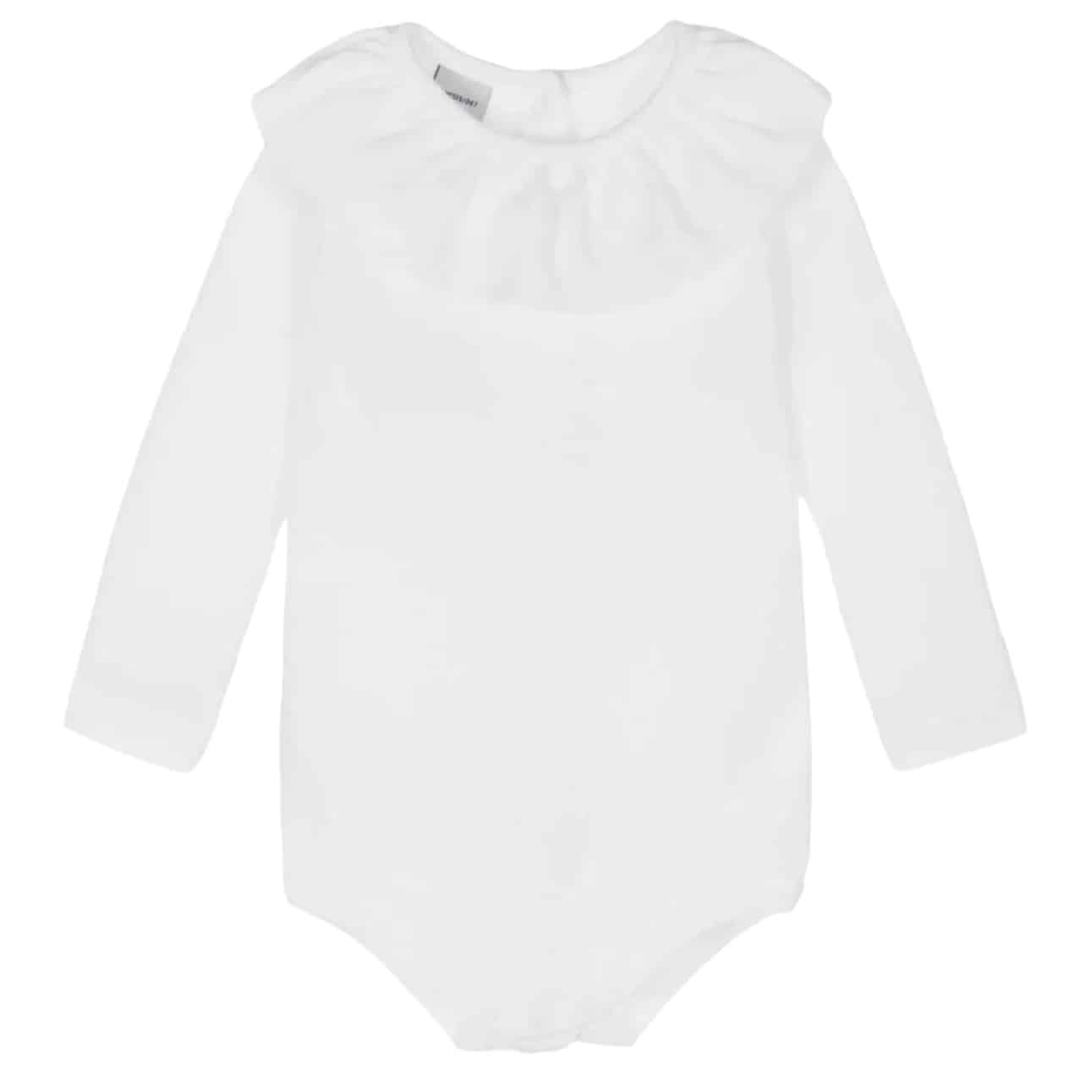 Lovely White soft cotton jersey bodysuit for baby girls & Boys by Babidu, with ruffles around the neck. It can be worn as a top, and will always remain neatly tucked in, keeping baby's back warm.