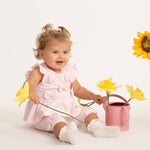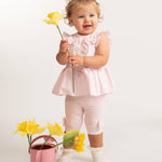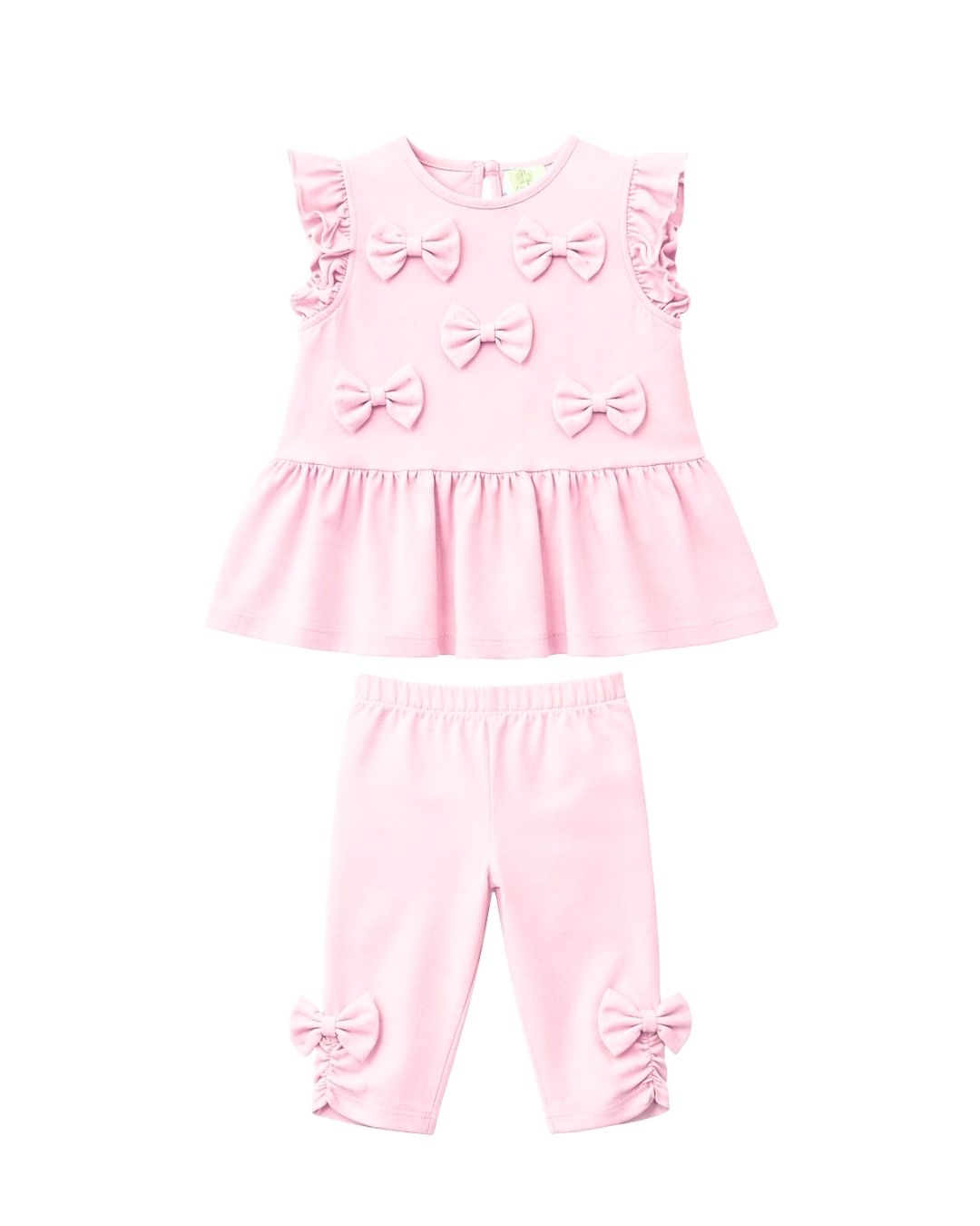 This adorable baby girls two-piece outfit is the perfect blend of comfort and timeless style. Crafted in a soft blush pink fabric, the set features a sleeveless peplum-style top beautifully detailed with delicate frill shoulders and charming bow appliqués across the front for an extra touch of elegance.