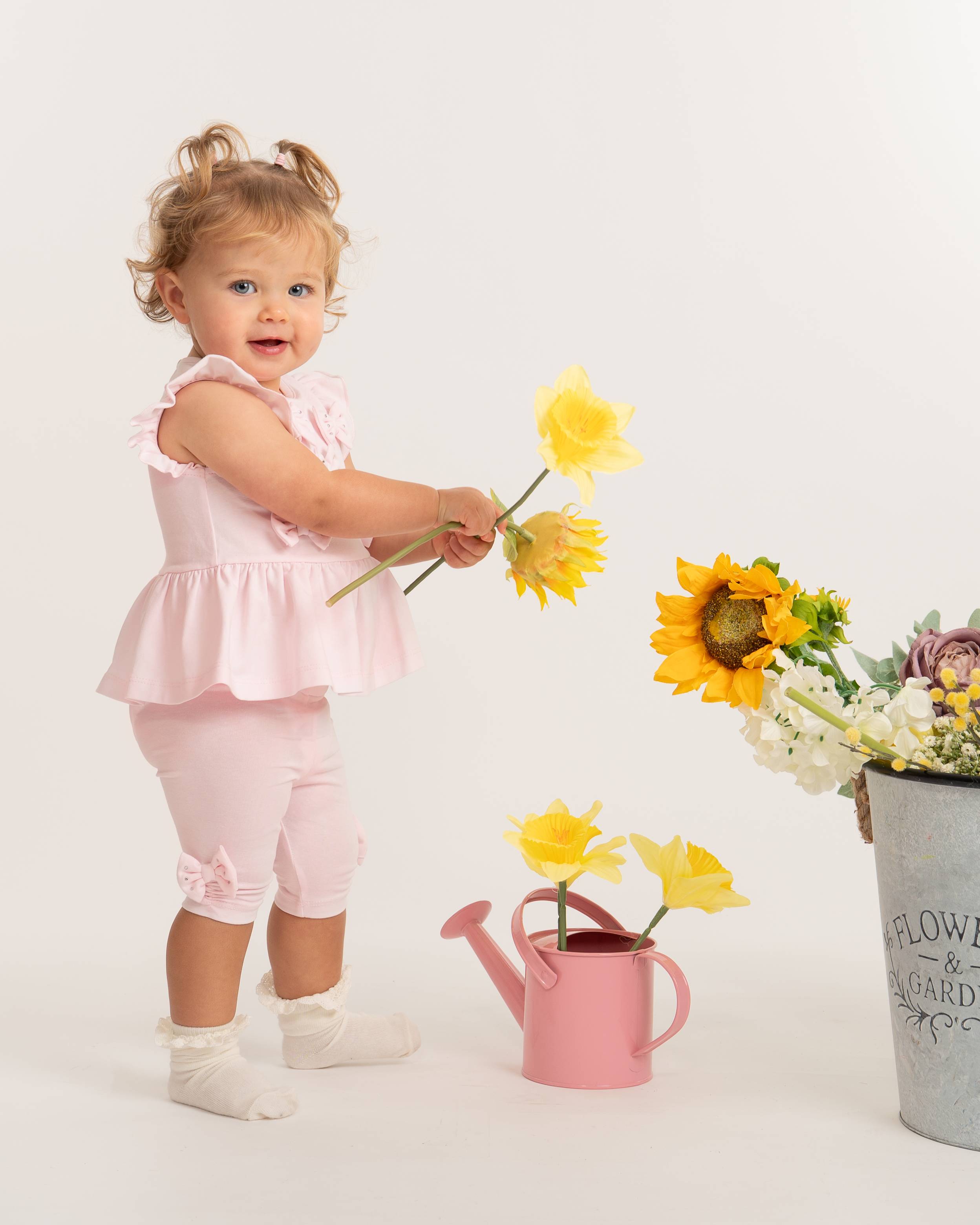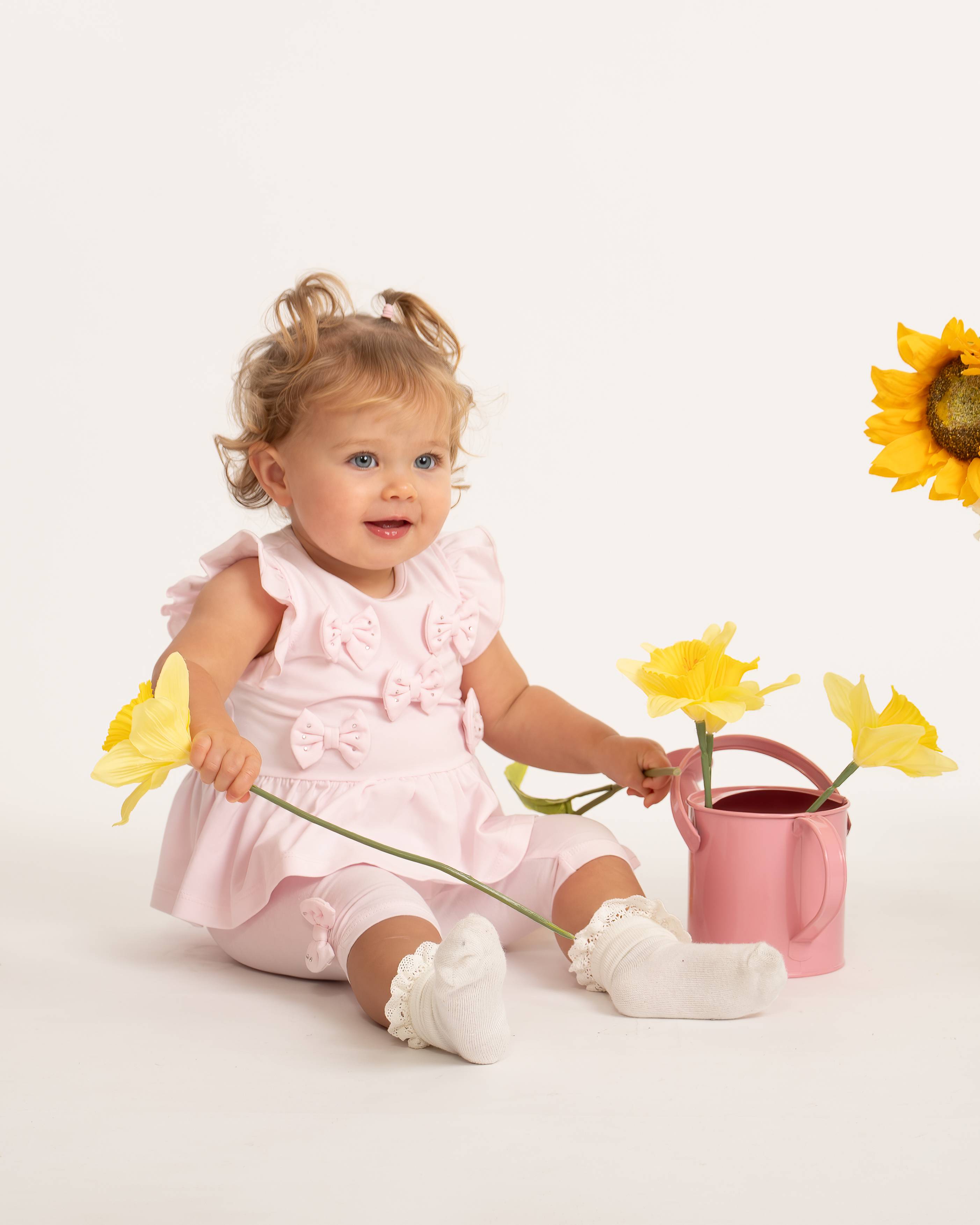 The matching leggings are designed with comfort in mind, featuring an elasticated waistband and sweet bow detailing with gentle ruching at the ankles. Soft, stretchy and breathable, this outfit is ideal for everyday wear, special occasions, or gifting.
