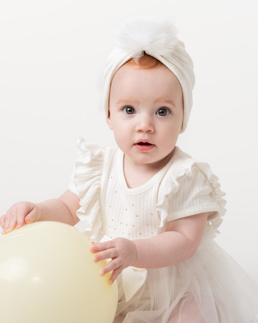 Lovely for a party, this ivory dress set for baby girls is by Caramelo Kids. The dress is made in soft ribbed cotton jersey, decorated with pretty ruffles, sparkly diamanté, and a fixed bow on the front. The gathered tulle skirt has attached jersey knickers which fasten with poppers between the legs. The dress comes with a matching turban style hat to complete the party look.