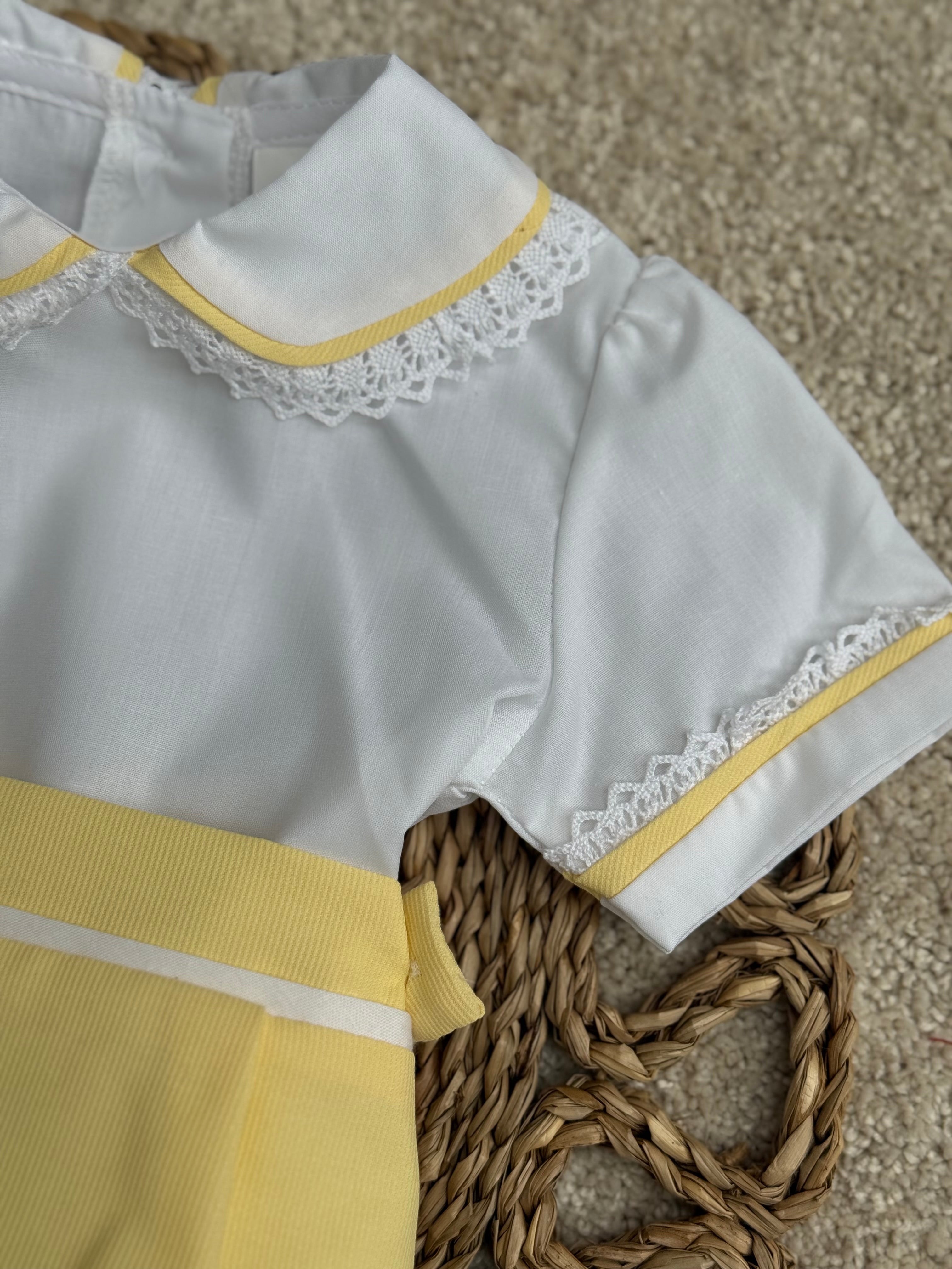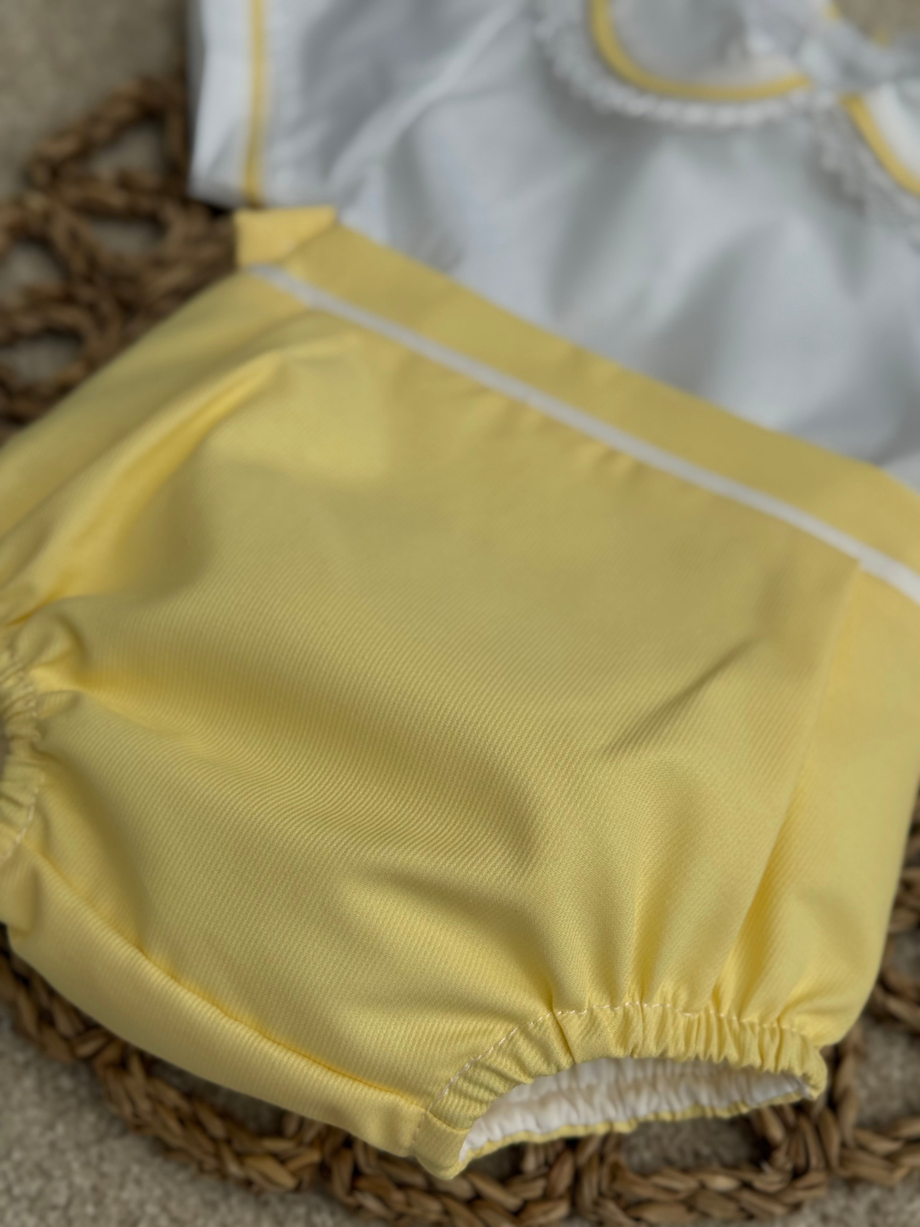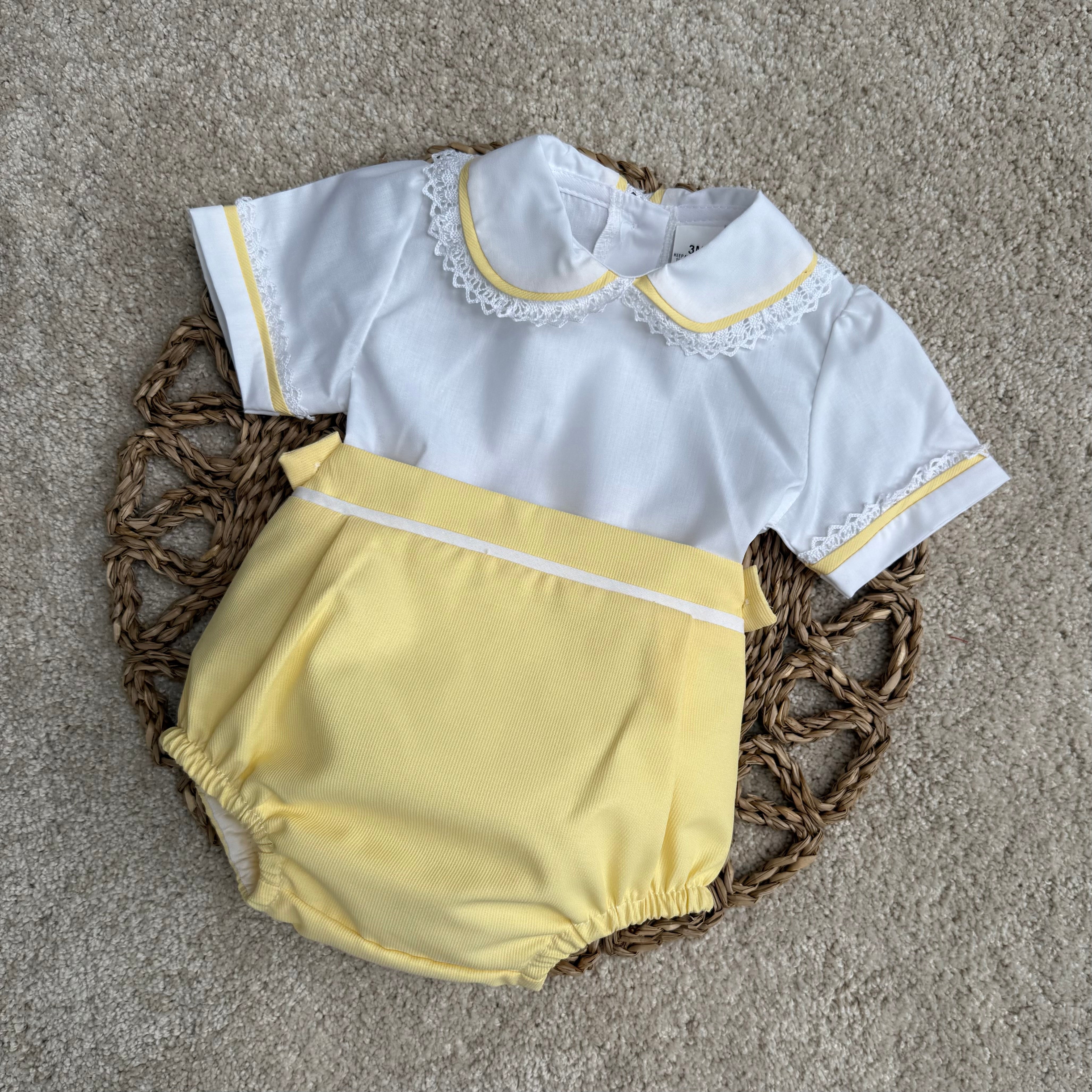 Baby Girls beautiful cotton Shirt and bloomers set, perfect for summer shirt has a beautiful trim detail on the collar and sleeve These are available in Lemon, Pink & Mint Green