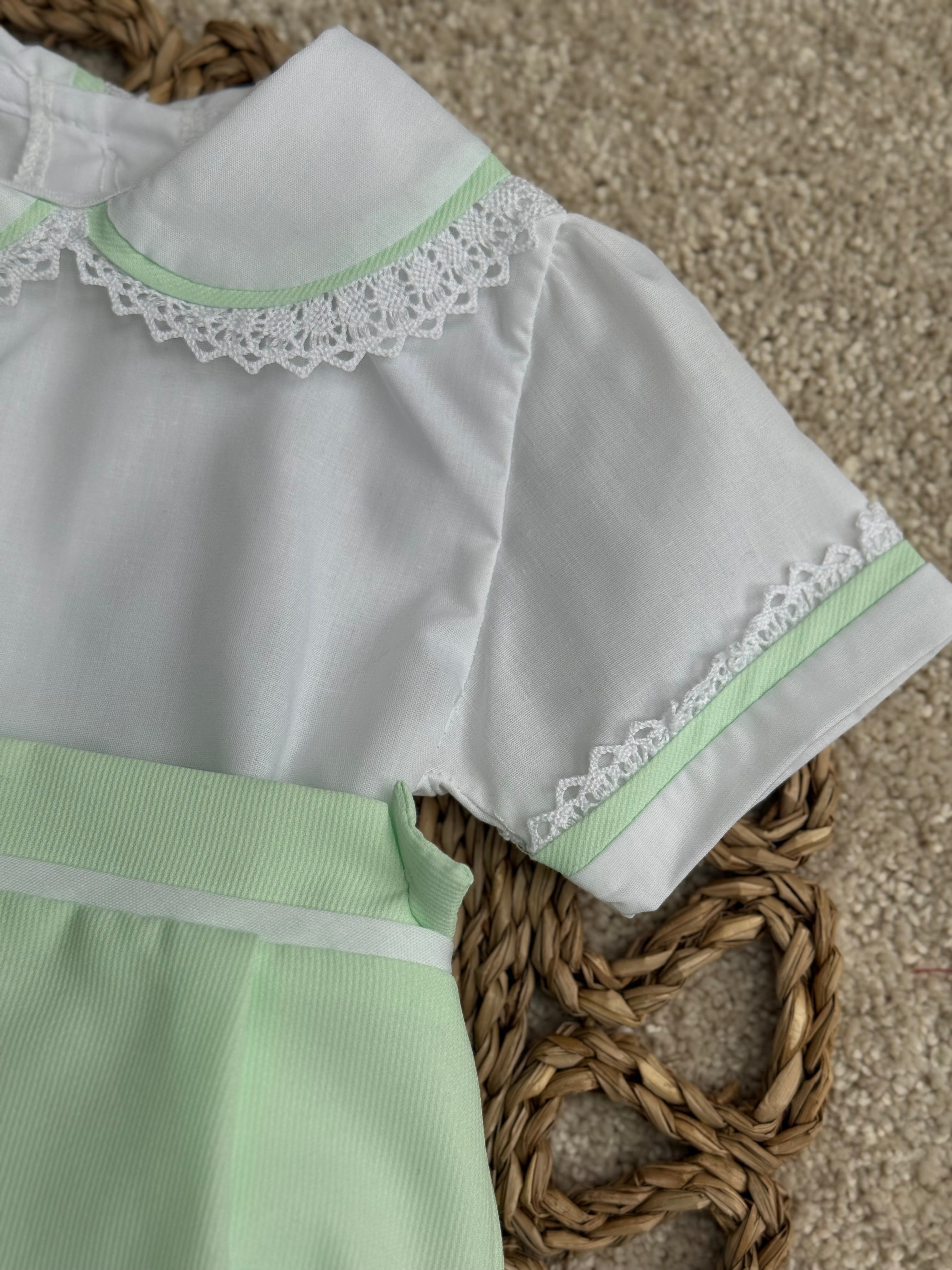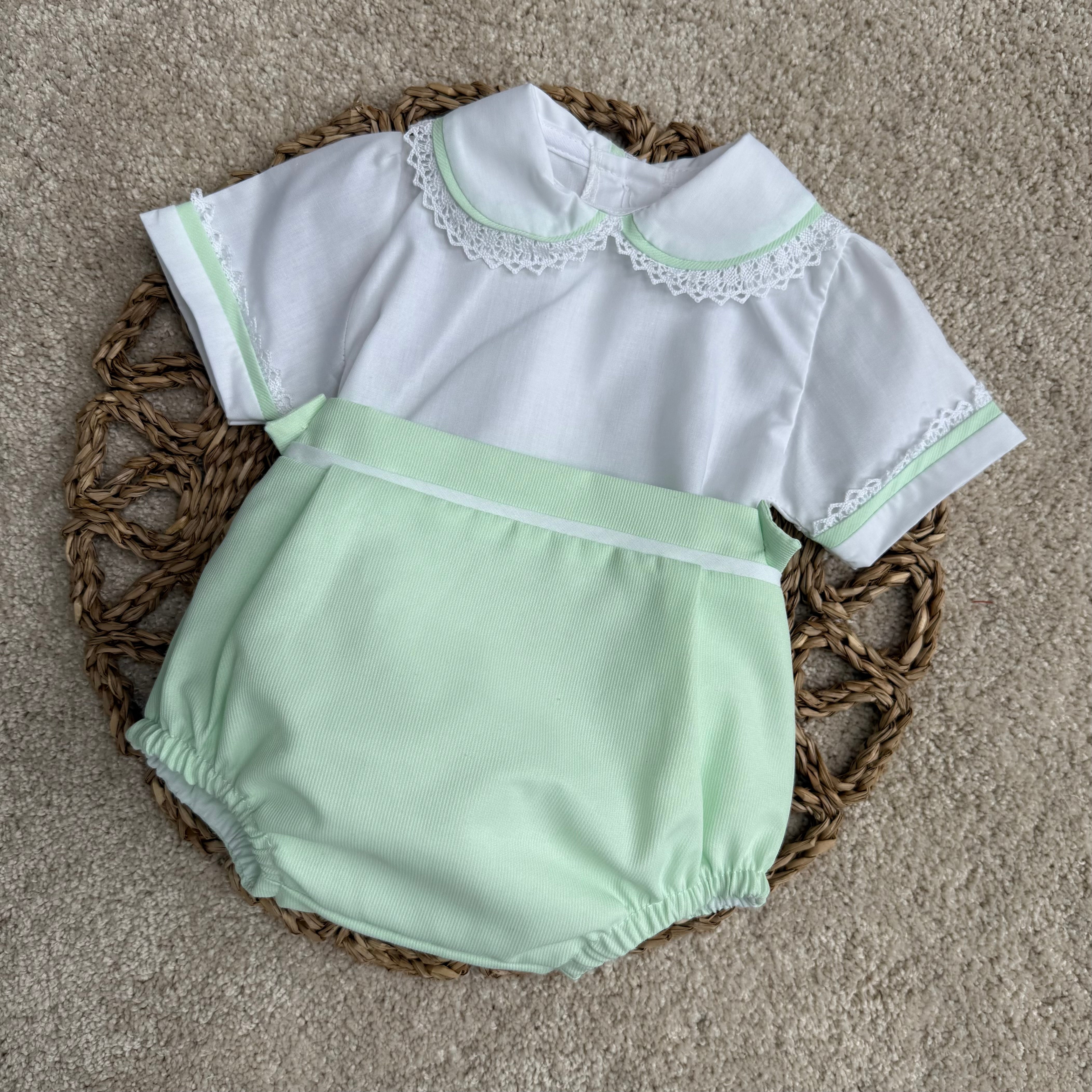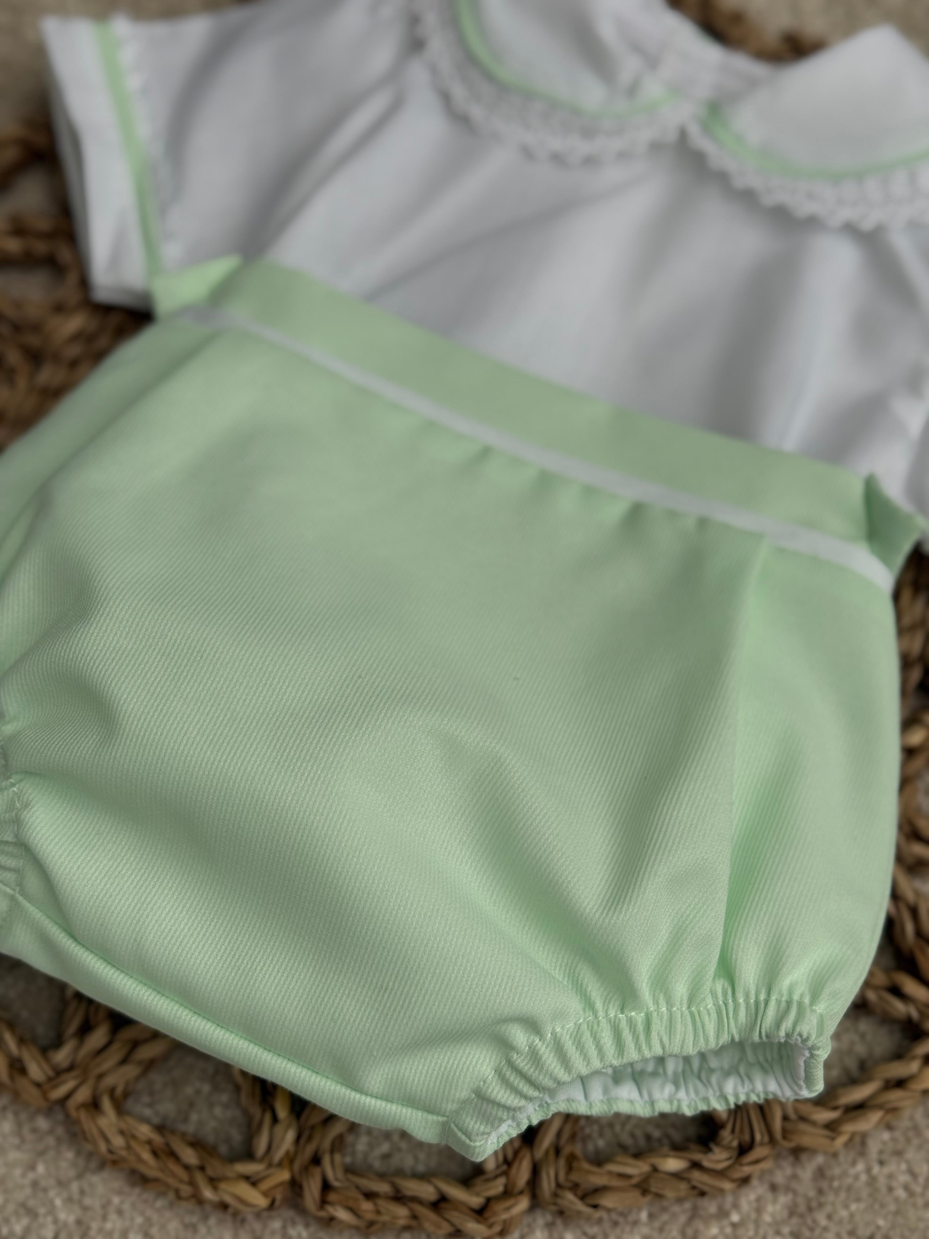 Baby Girls beautiful cotton Shirt and bloomers set, perfect for summer shirt has a beautiful trim detail on the collar and sleeve These are available in Lemon, Pink & Mint Green