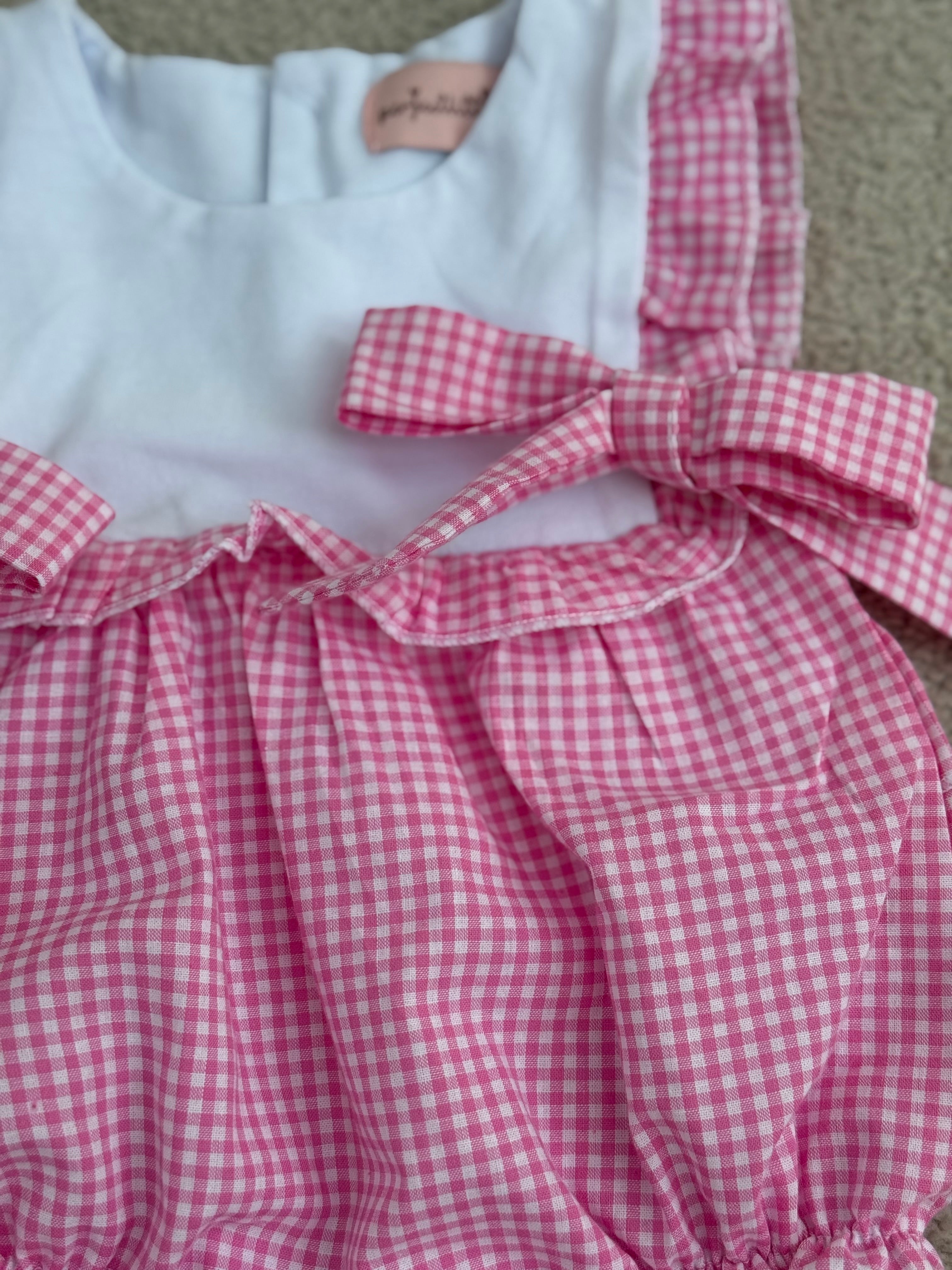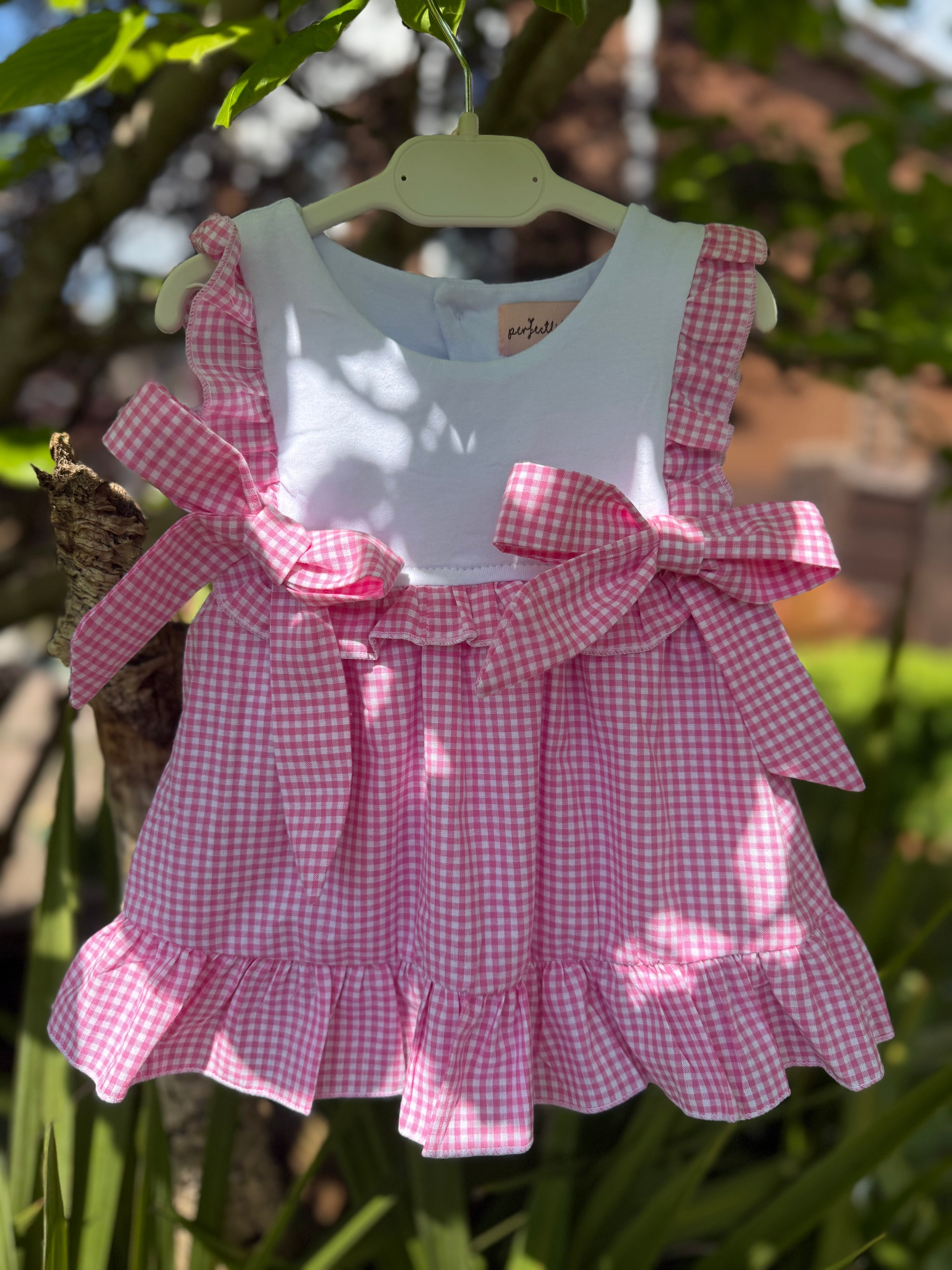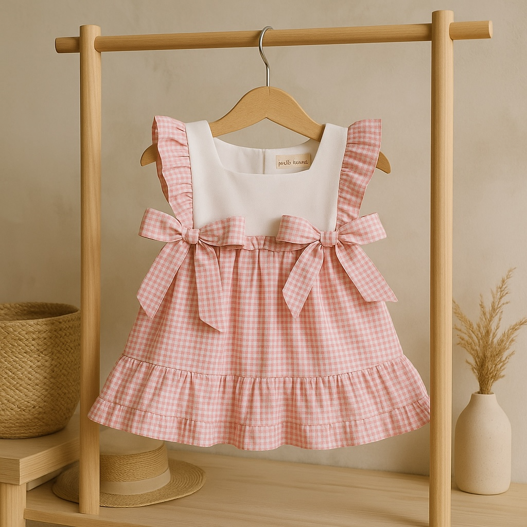 Sweet and timeless, this pink gingham dress is perfect for sunny days and special moments. Made from soft, breathable cotton, it features delicate shoulder ruffles, a crisp white bodice, and two charming bows for an extra touch of charm. The gathered skirt with a ruffled hem adds a playful silhouette, making it ideal for twirling and all-day comfort. A must-have for your little one’s wardrobe.
