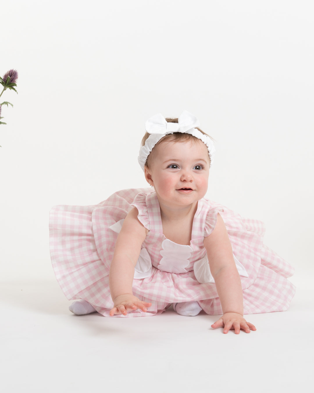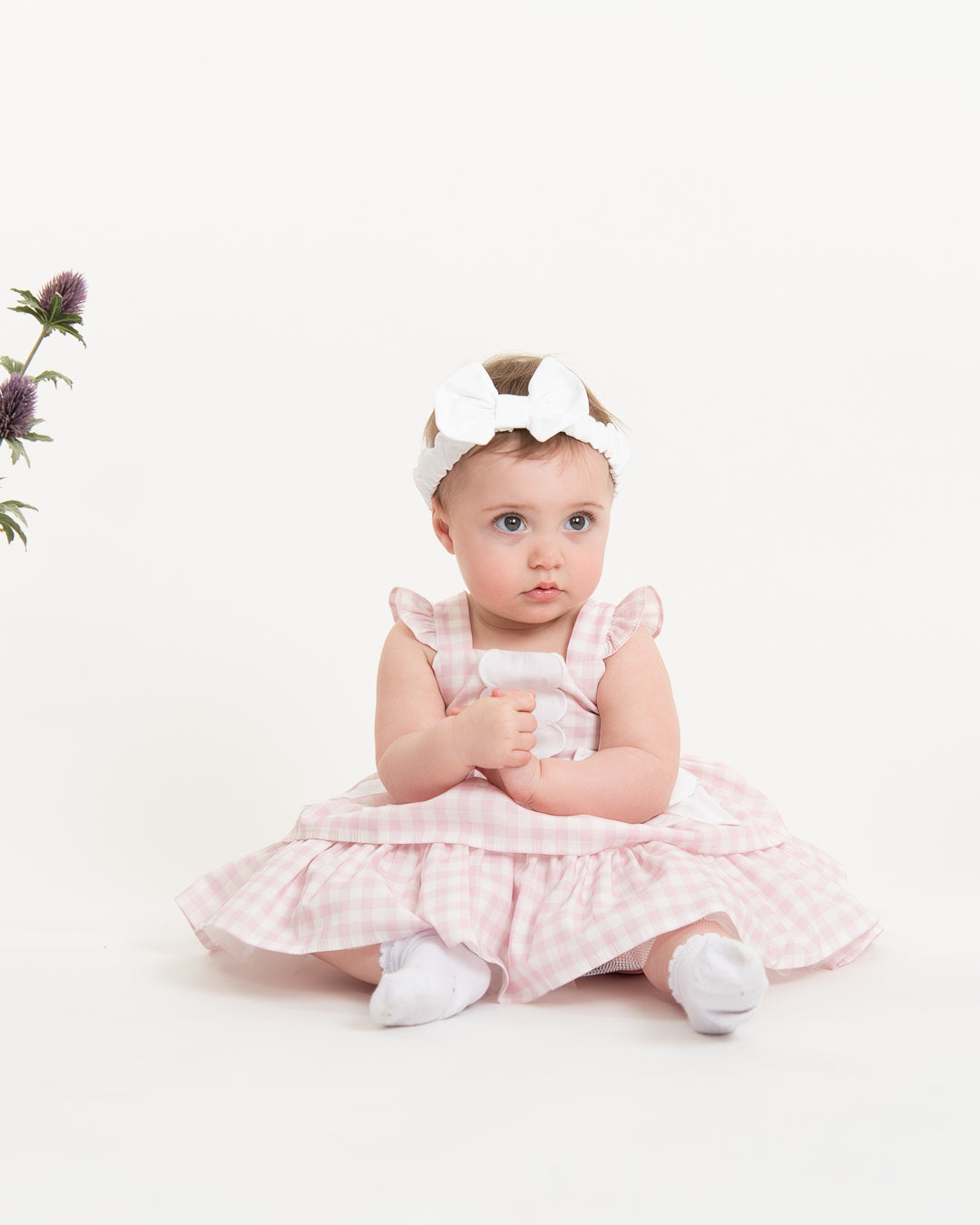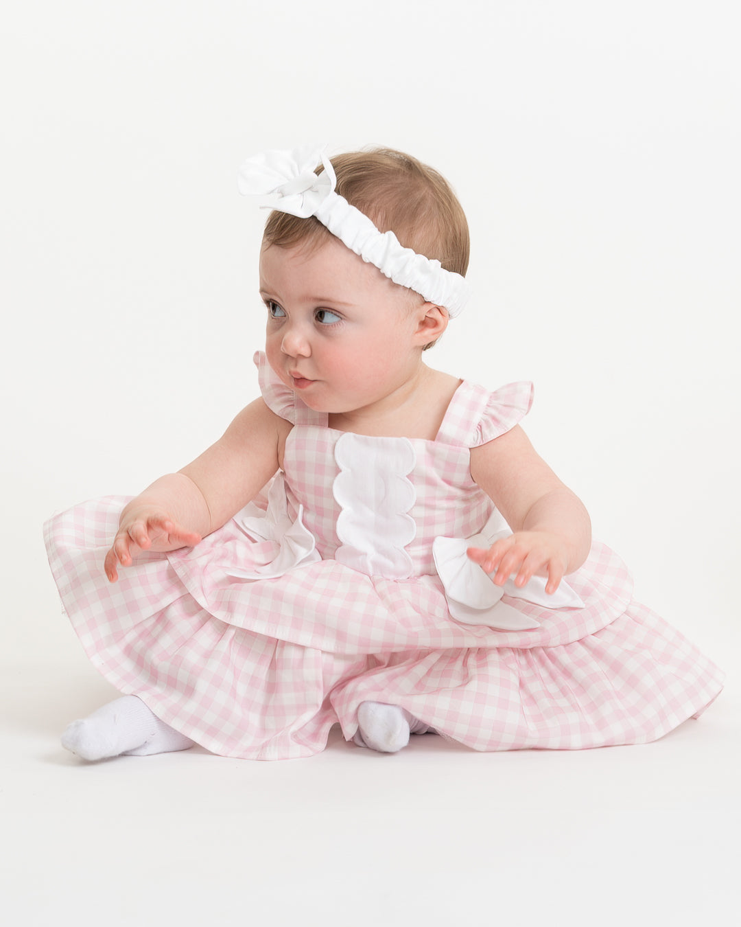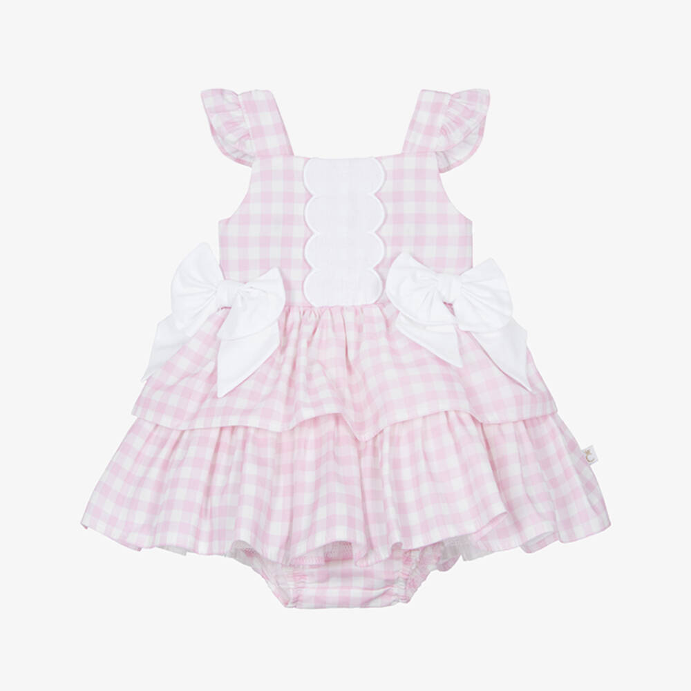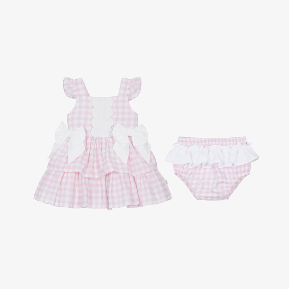 Pink and white gingham checked dress for baby girls by Caramelo Kids, made in soft cotton. This cute dress has ruffled short sleeves and a shirred back for a good fit. It is fully lined and the tiered skirt has tulle layers for added volume. There are fixed white bows and trims on the front for a pretty finish and it comes with a matching pair of knickers