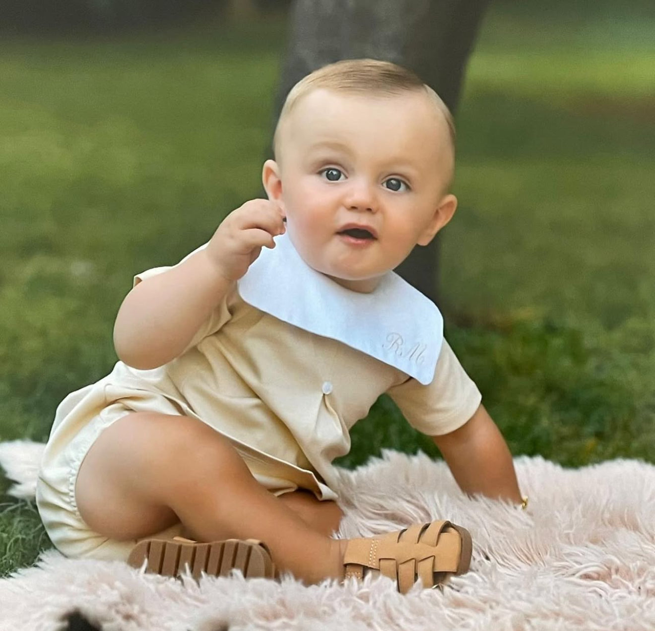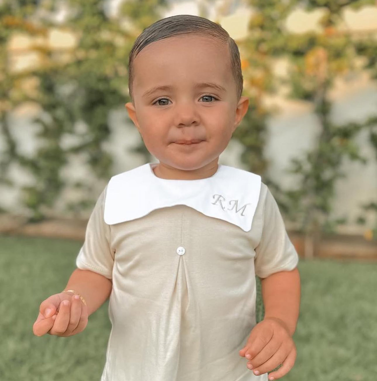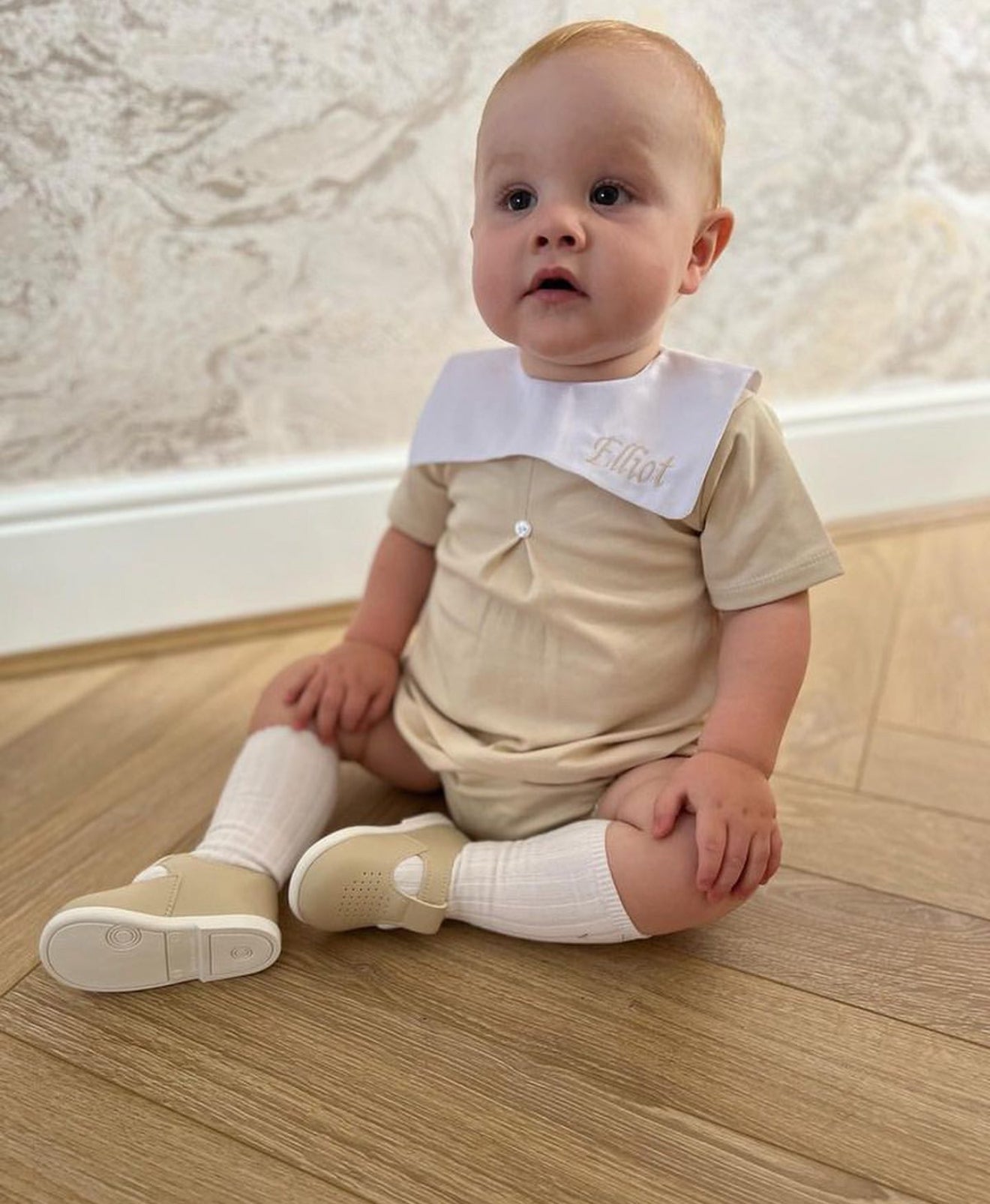 - A crisp white oversized collar, which can be personalised with your baby’s initials or name – adding a special touch that makes it uniquely theirs.
