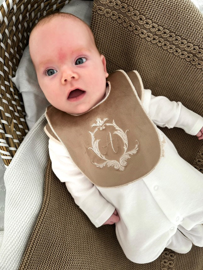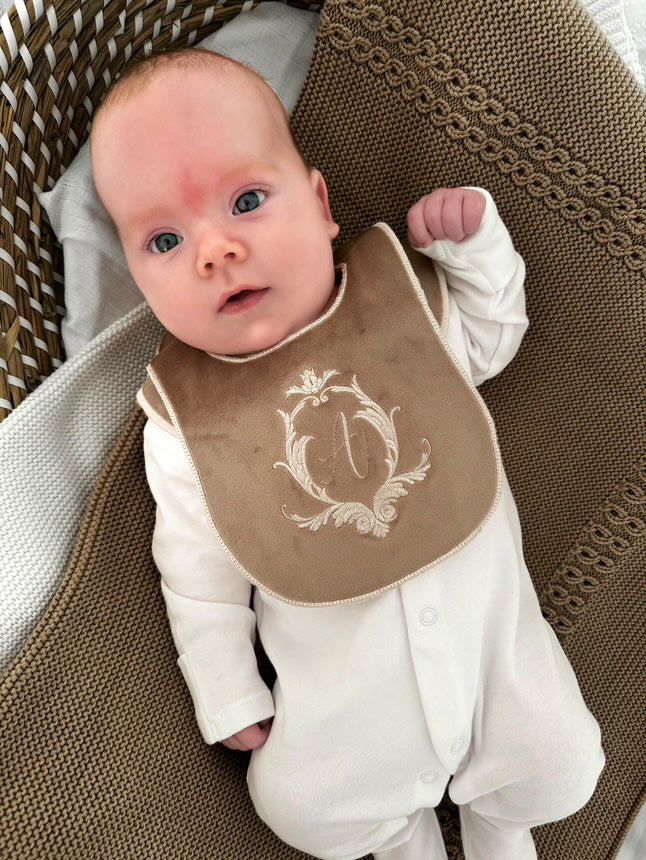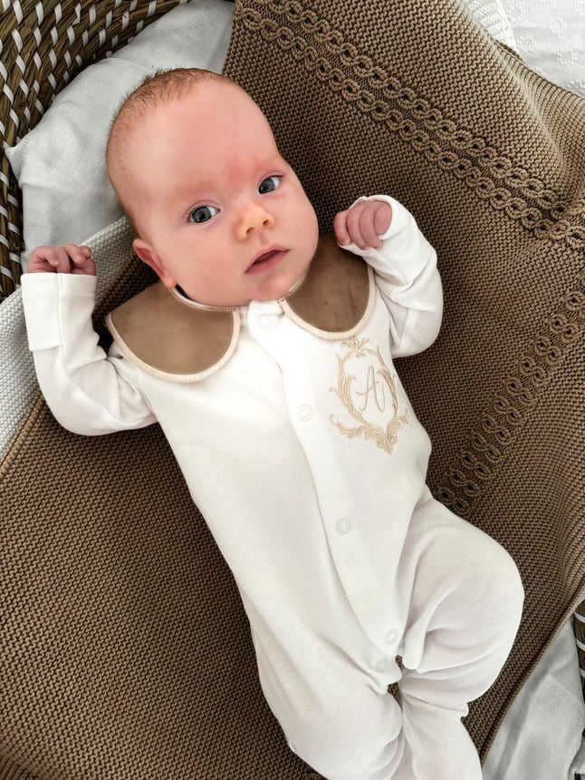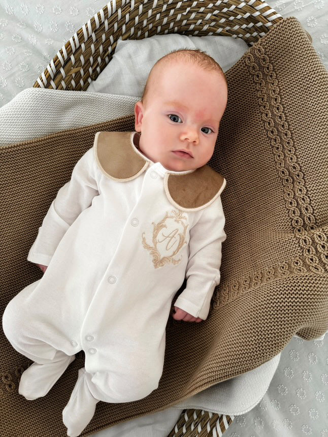 This handmade sleepsuit set is a charming and cozy choice for your little one. Crafted with love and care, the set features a soft, comfortable sleepsuit with a luxurious velvet collar, adding an elegant touch to the overall design. The included handmade bib is adorned with an embroidered crest, giving it a whimsical, vintage-inspired look that’s both adorable and timeless.