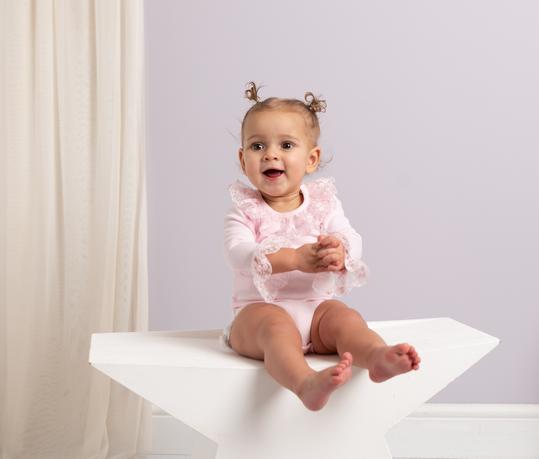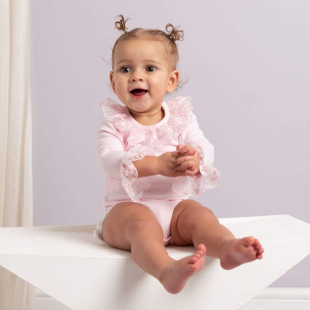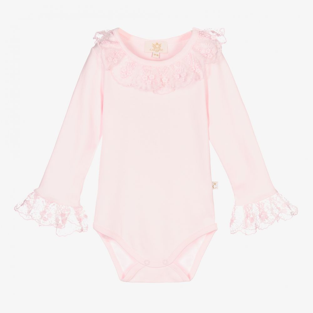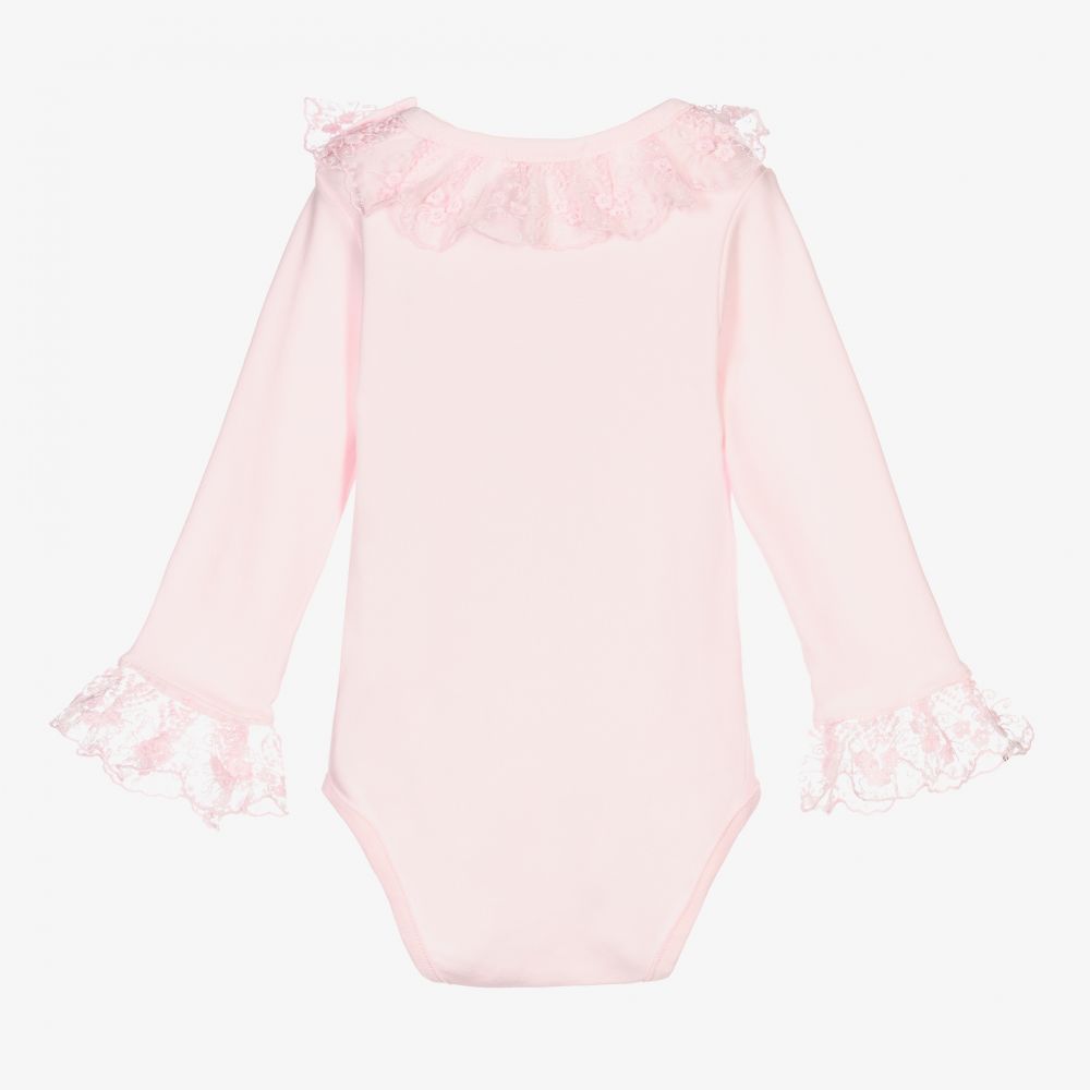 Pink bodysuit for baby girls by Caramelo Kids, made in soft cotton jersey. It has a beautiful pink lace ruffle collar, with matching lace trim on the cuffs. There are popper fastenings between the legs.