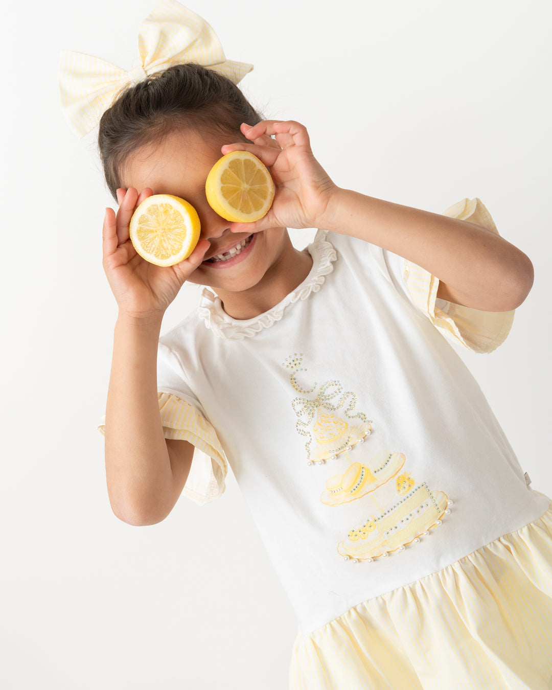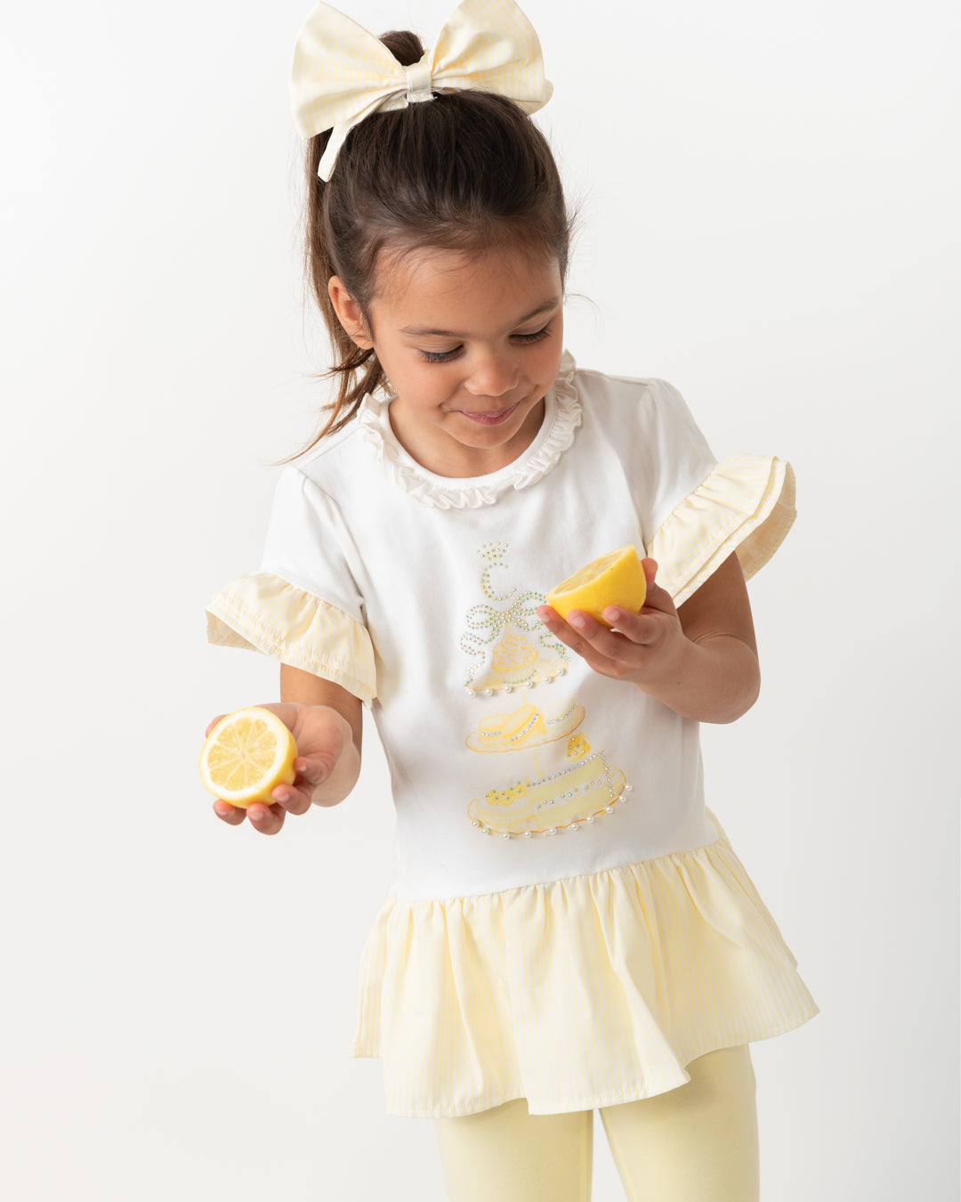 Pretty white and Lemon leggings set for girls by Caramelo Kids, made in soft jersey. The top has lovely layered cotton sleeves and a tiered cotton hem. The front features a sweet ballerina shoes design with pink tulle bows, sparkly diamanté and pearl beads. The full length leggings have matching tulle trims around the ankles and an elasticated waistband for comfortable wear.