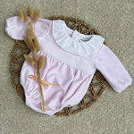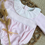 Dress your little one in timeless elegance with this baby pink velour smocked romper. Crafted from soft and cosy velour, this romper features delicate hand-smocked detailing across the chest and a crisp white Peter Pan collar for a classic finish. The long sleeves and gentle elasticated legs provide comfort and ease of movement, while the back popper fastening makes dressing simple. Perfect for special occasions, christenings, or everyday wear, this baby romper combines traditional charm with modern comfort.
