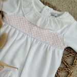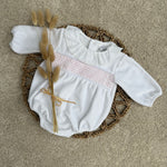 Dress your little one in timeless elegance with this baby pink velour smocked romper. Crafted from soft and cosy velour, this romper features delicate hand-smocked detailing across the chest and a crisp white Peter Pan collar for a classic finish. The long sleeves and gentle elasticated legs provide comfort and ease of movement, while the back popper fastening makes dressing simple. Perfect for special occasions, christenings, or everyday wear, this baby romper combines traditional charm with modern comfort.