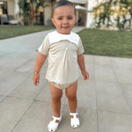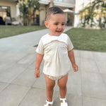 Perfect for birthdays, family photos, or simply stylish everyday wear, this set is made to be cherished. Its clean, neutral tones make it a timeless addition to your little boy’s wardrobe.