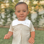 - A crisp white oversized collar, which can be personalised with your baby’s initials or name – adding a special touch that makes it uniquely theirs.
