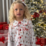 The pyjamas are finished with thoughtful details including a classic Peter Pan collar with red piping, frilled cuffs and hems for a touch of elegance, and red button fastening down the front. The chest also features a sweet embroidered initial for a personal festive touch.Perfect for cosy nights, Christmas Eve traditions, or those all-important festive morning photos by the trees