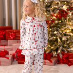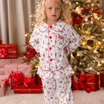 Make Christmas extra magical with this beautiful girls Christmas pyjama set. Designed in soft cotton for comfort, this two-piece set includes a button-up top and matching trousers, both featuring a festive all-over print of nutcrackers, candy canes, bows, presents and Christmas trees.