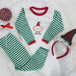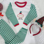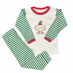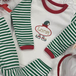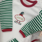 White cotton pyjama long sleeve top with red piping around the neck and wrists with green and white stripes on the arms.