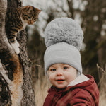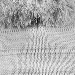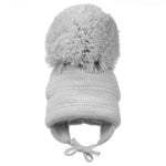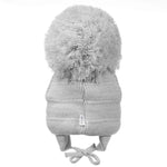 Grey knitted hat for Boys by Sätila of Sweden. Made in soft acrylic, with ear flaps and a warm fleece lining. It has a Big giant pom-pom on top and knitted ties to secure under the chin.