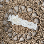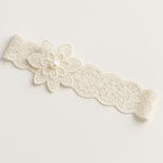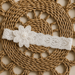 This is a beautifully crafted lace baby headband featuring an elegant, vintage-inspired design. The band itself is made from delicate cream lace with intricate floral and swirl patterns. At the center, there’s a standout embroidered flower applique with layered lace petals and a pearl-like bead in the middle, adding a touch of timeless charm.