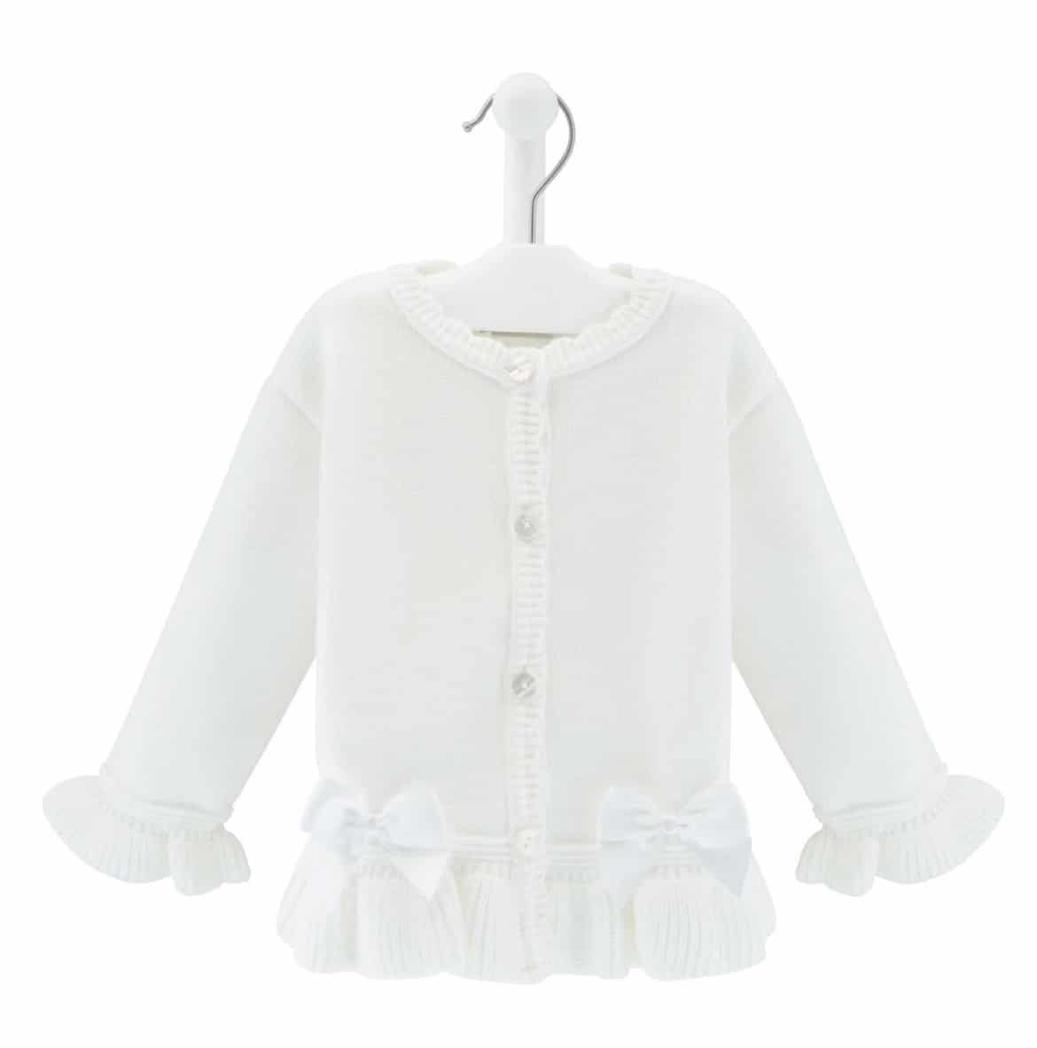 Girls beautiful cardigan with Ruffle detail on hem and sleeves and 2 satin bows on front.