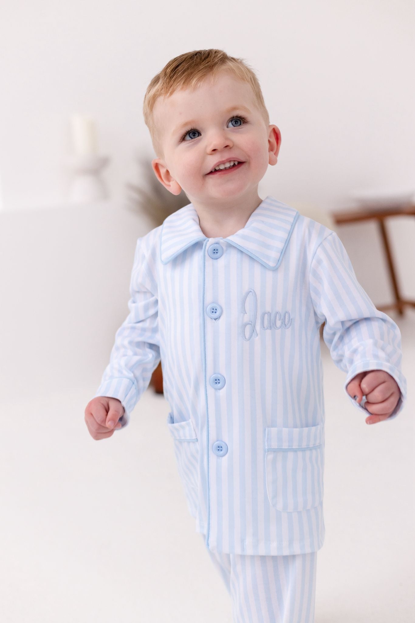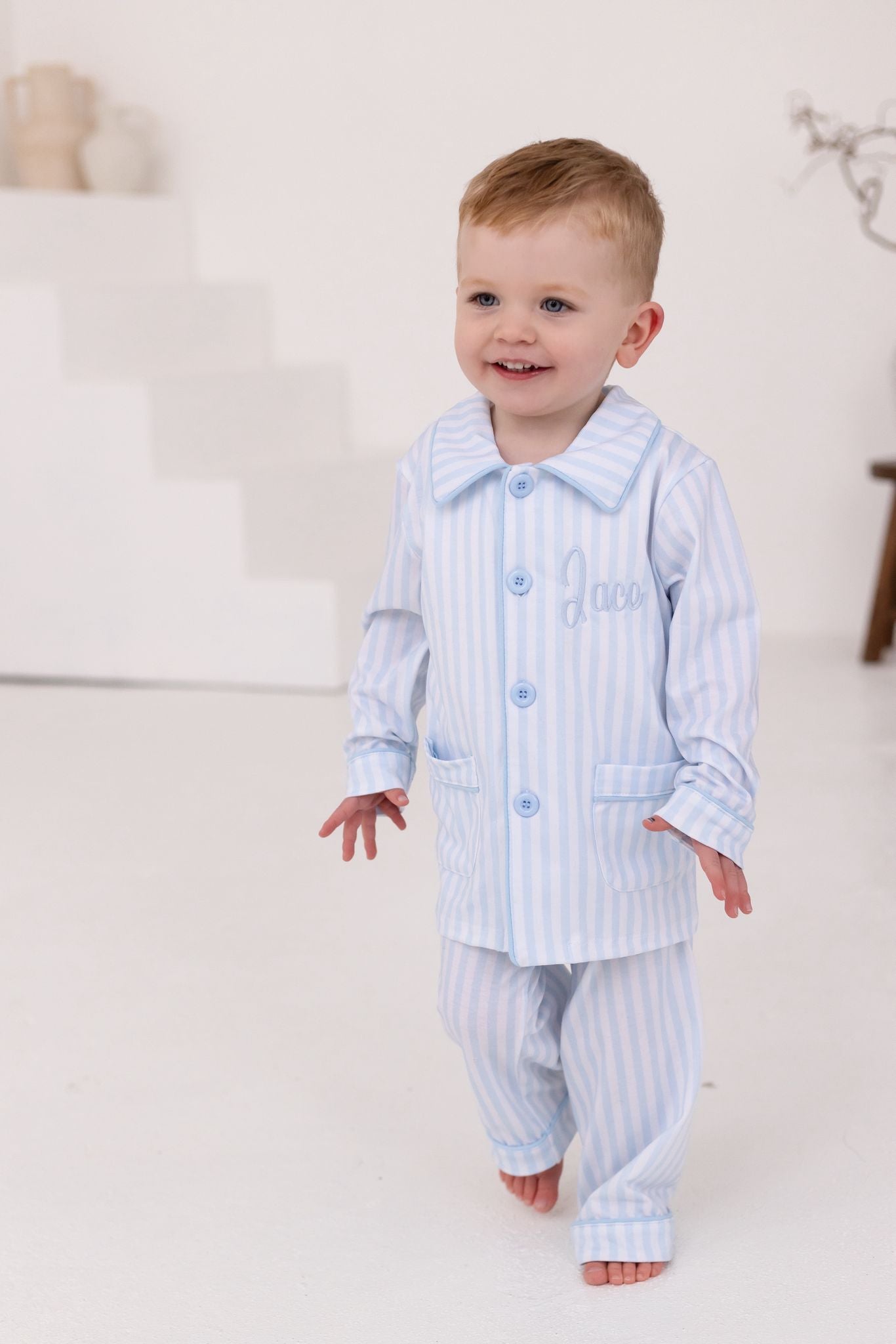Our Boys Stripe Pyjama Set brings timeless luxury to bedtime with a beautiful soft blue Stripe print and a classic, tailored finish. Designed with a button-front top and traditional collar (no frills), this set is perfect for boys who love comfort while still looking smart and put-together.