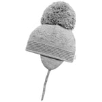 knitted hat by Sätila of Sweden. Made in soft acrylic, with ear flaps and a warm fleece lining. It has a Big pom-pom on top and knitted ties to secure under the chin.