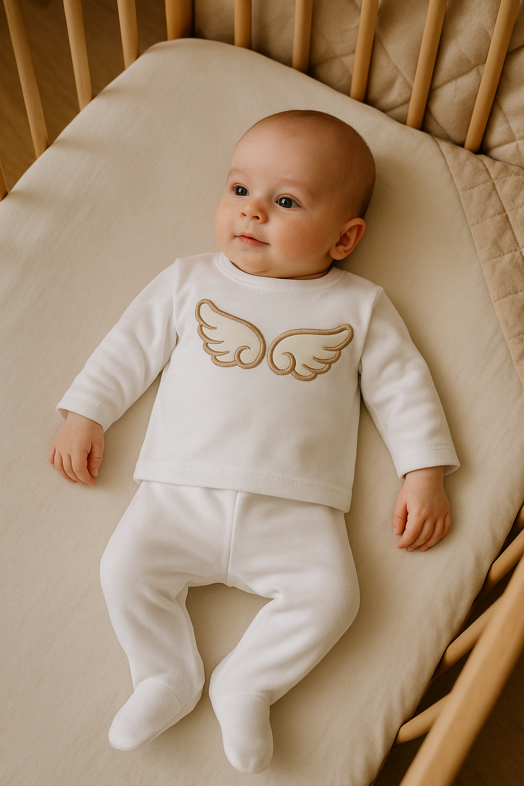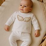 2-piece baby set, for baby boys and girls, made in beautifully soft, white cotton jersey. comes with Top and pants and fastens on the back with poppers. The trousers have an elasticated waistband for comfort.