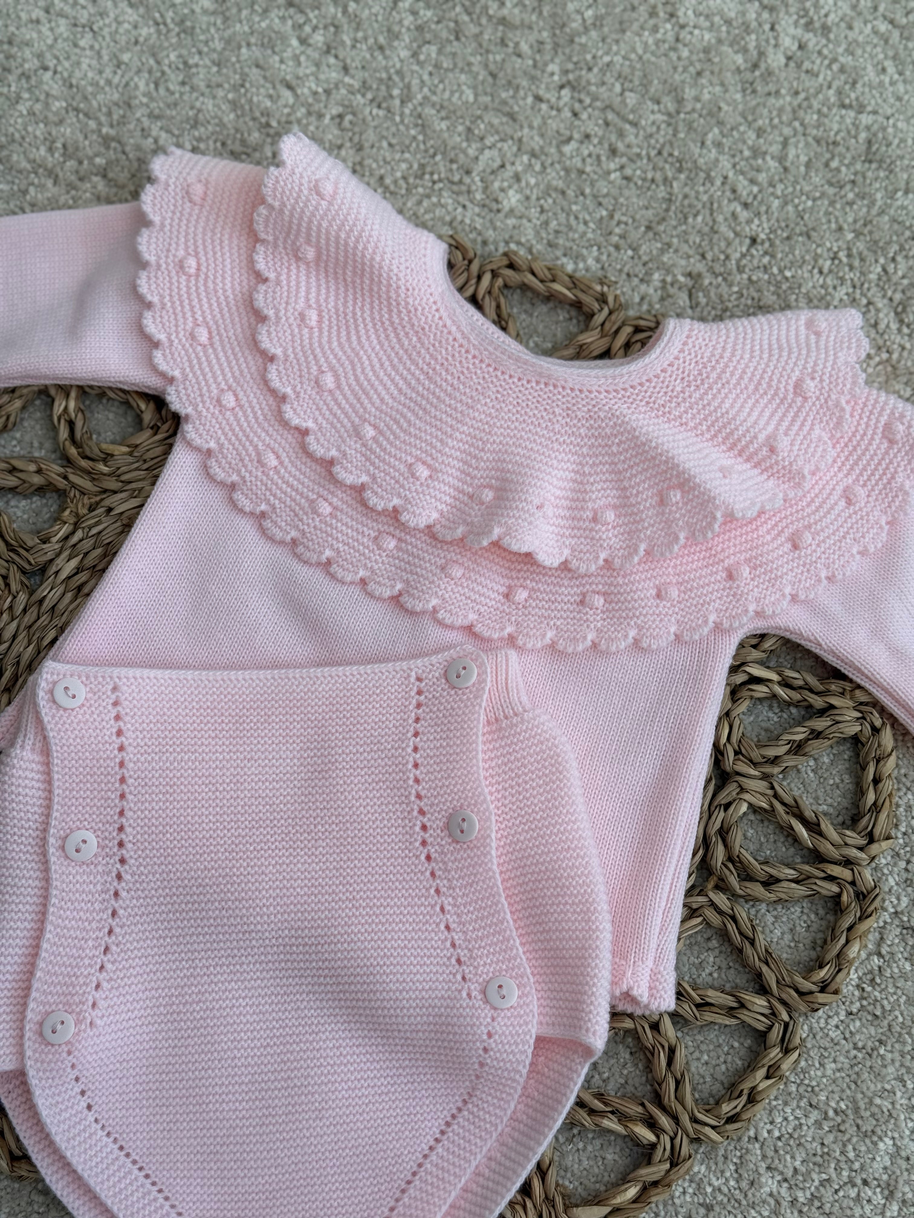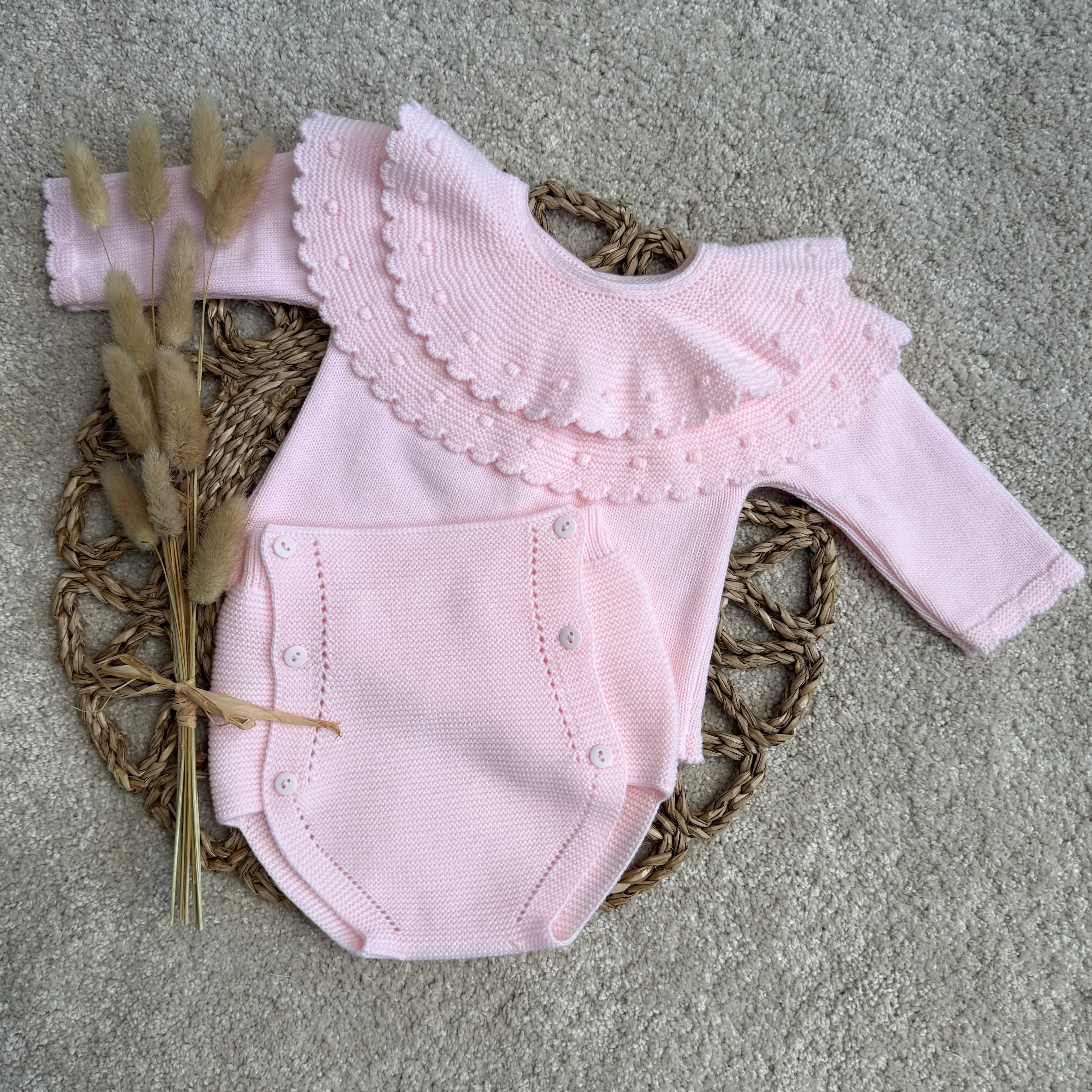 Dress your little one in timeless elegance with this beautiful Spanish baby outfit, crafted from soft acrylic wool for ultimate comfort and warmth. Designed with love and attention to detail, this two-piece set includes a long-sleeved top with a double-layered frill collar featuring delicate scalloped edging and textured bobble details, paired with matching button-front knitted shorts for a charming and traditional look.