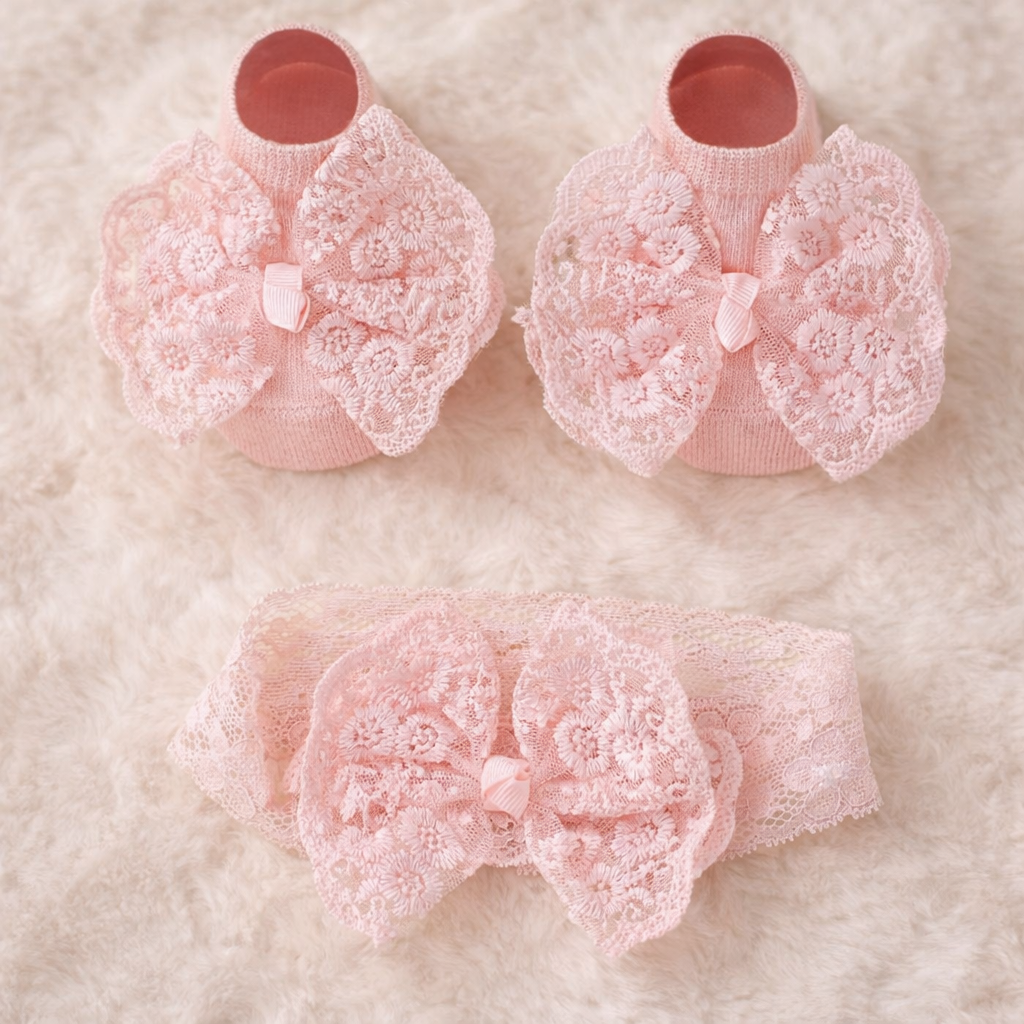 Baby Girls Pink Lace Bow Headband & Booties