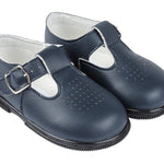 Children's Navy blue, first walker shoes by Early Days. Baypods are made from faux patent leather with a dainty holed pattern on the front. Traditional in style, they have ankle support, with a T-bar and buckle fastening strap.