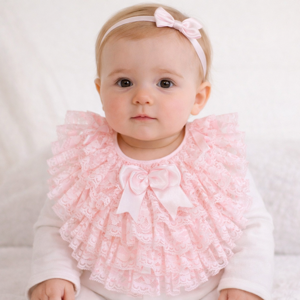 Pretty pink bib for baby girls by Caramelo Kids, decorated with rows of delicate lace and finished with a satin bow in the middle. It ties around the neck with satin ribbons and is lined in comfortable and soft cotton.