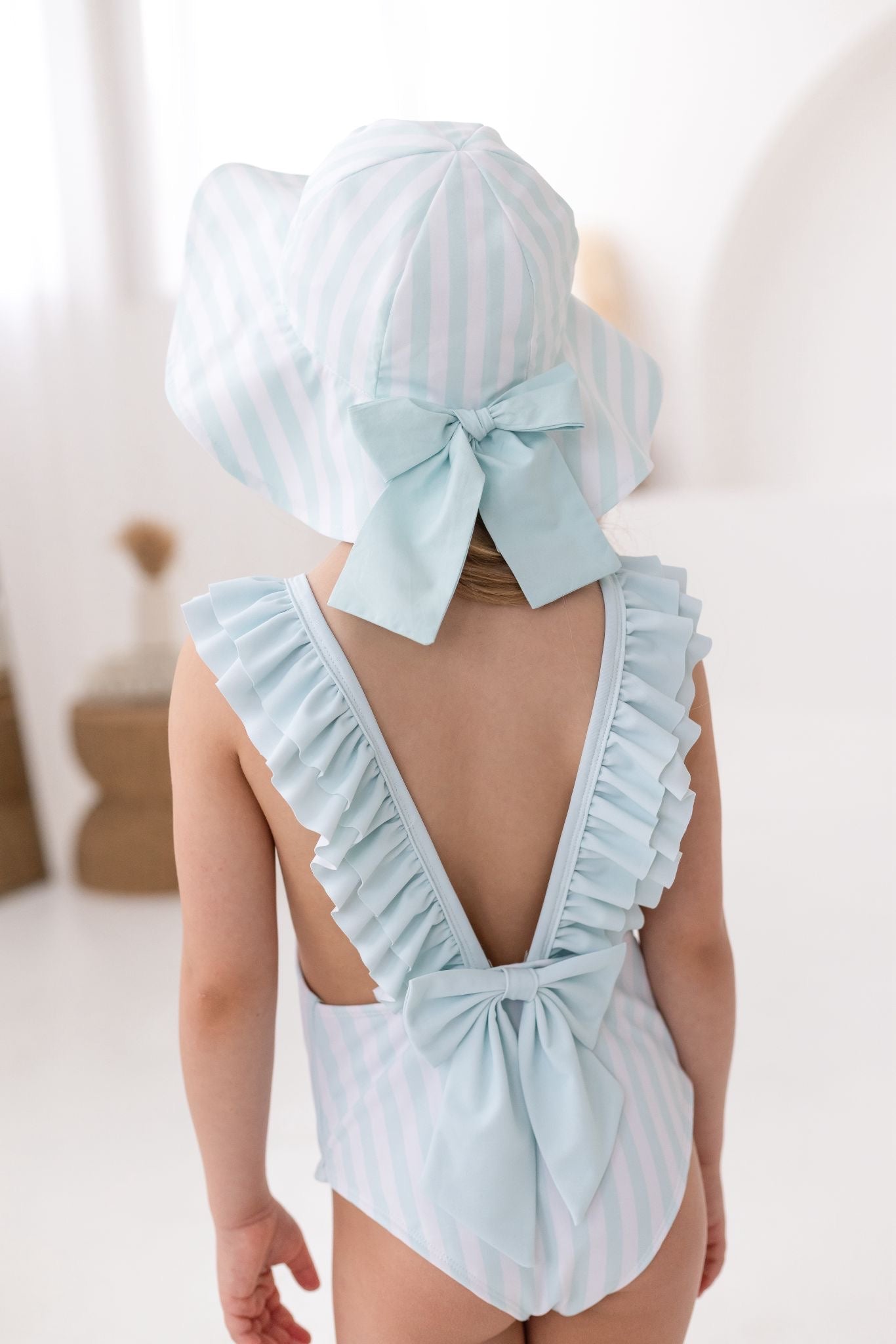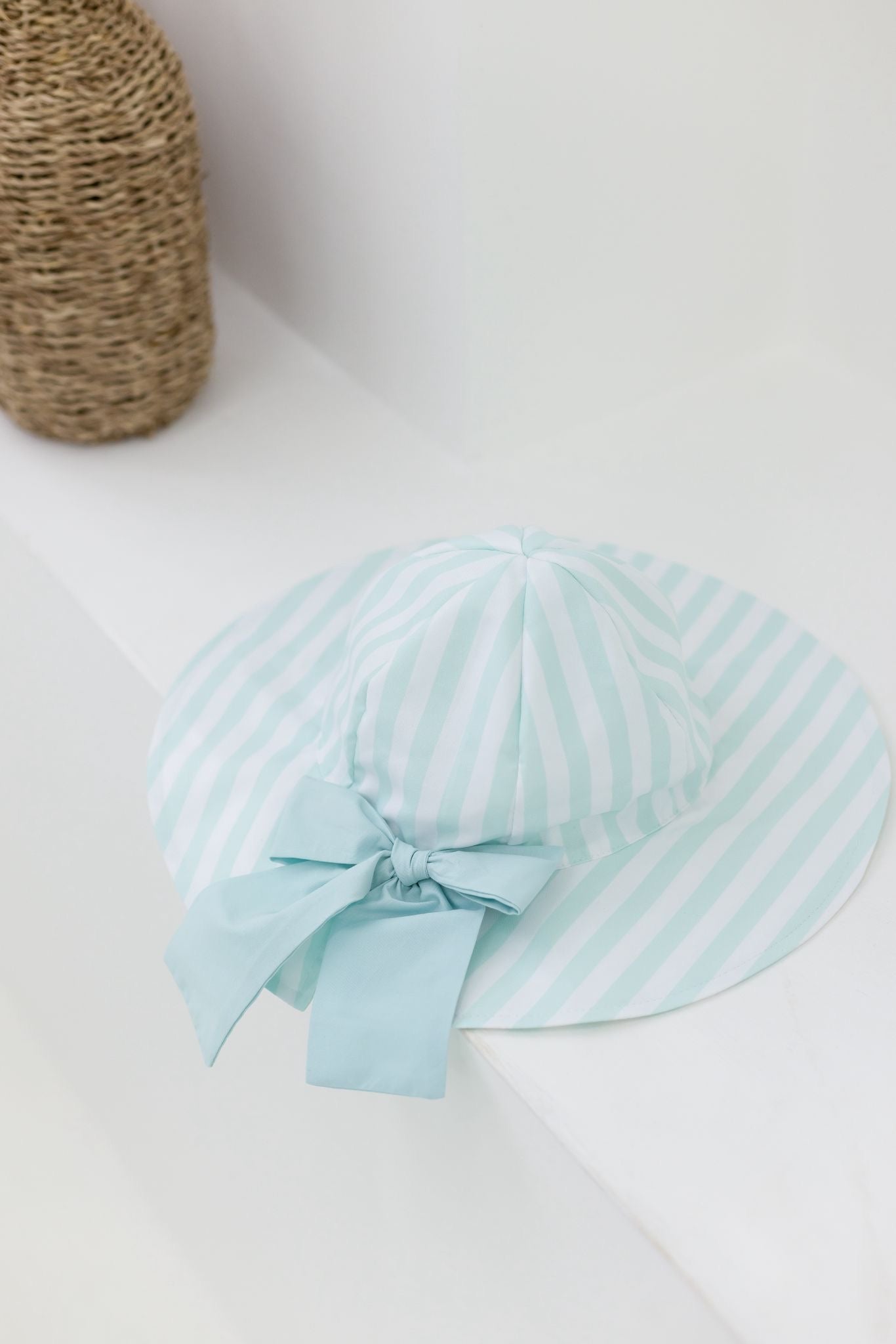 The classic stripe pattern in fresh white and pastel green gives a timeless holiday feel, while the wide brim offers plenty of shade to help protect delicate skin from the sun. perfect for breezy beach days or garden play.