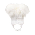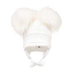 Adorable White hat for little Children by Sätila of Sweden. It is made in knitted acrylic with cotton lining and has two faux fur padded pompoms on the top.