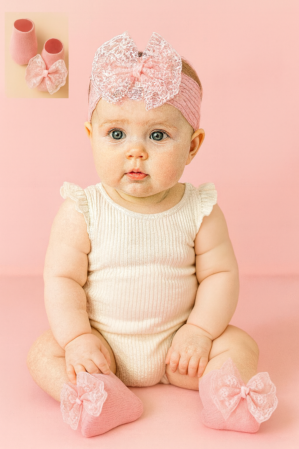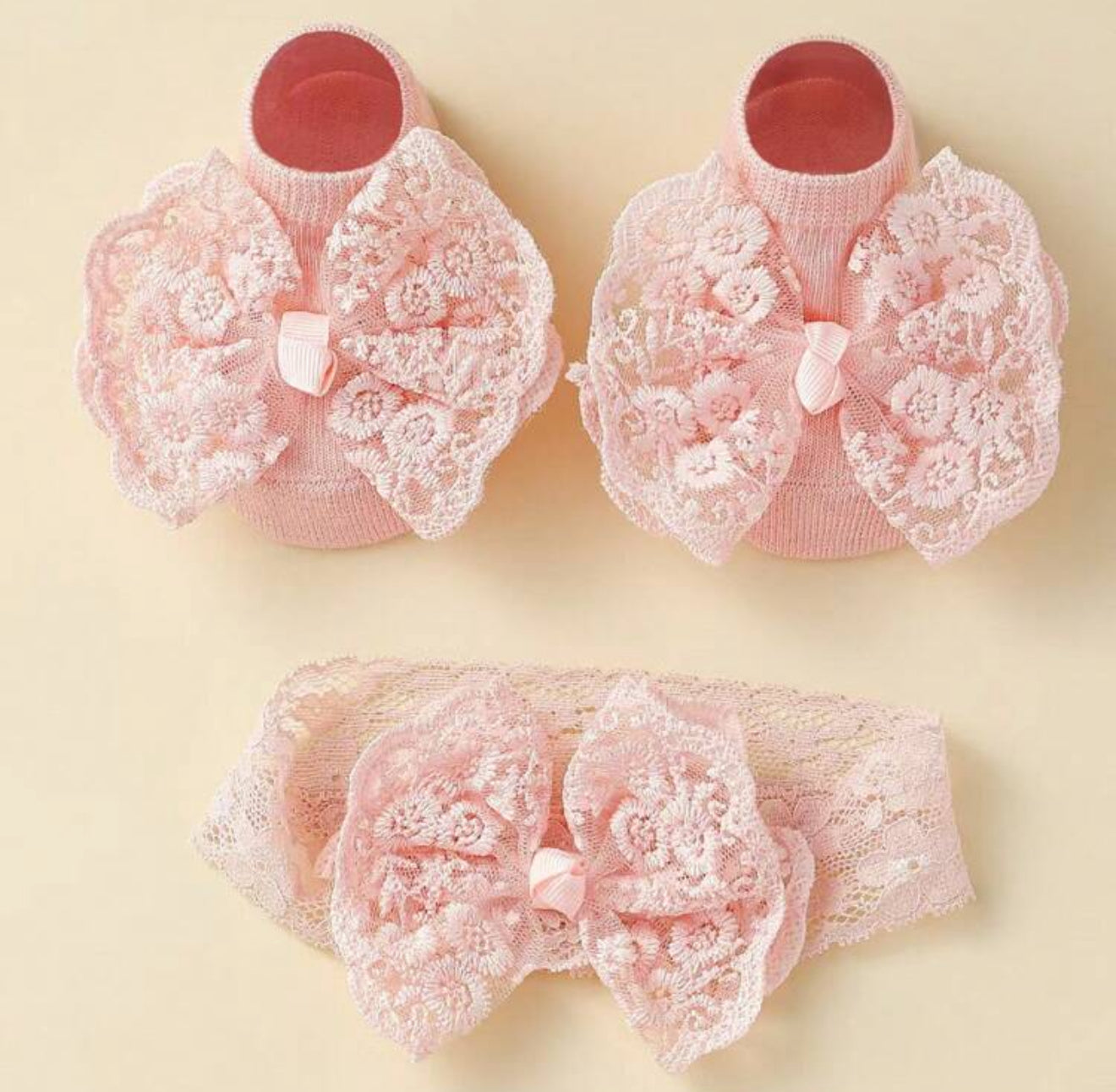Dress your little princess in pure elegance with our beautiful baby girls pink headband and booties set. Designed with delicate detail and comfort in mind, this matching set is perfect for newborn photoshoots, baby showers, christenings, birthdays and everyday adorable outfits.