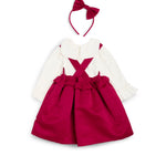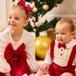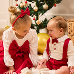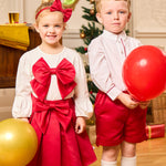 A charming red skirt set for girls by Caramelo Kids. The off-white top is made in soft cotton jersey, with pretty puffed sleeves and a keyhole button fastening on the back. A large red sateen bow on the front coordinates with the box-pleated skirt, which is lined for comfort. It has an adjustable waist for a great fit and a concealed side zip fastening. A matching red hairband completes the stylish look.
