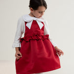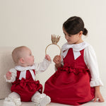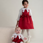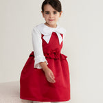 A charming red and white dress set for girls by Caramelo Kids. The off-white top is made in soft cotton jersey, with pretty ruffle trims on the cuffs, an oversized collar shaped into a large bow and a keyhole button fastening on the back. Made in smooth sateen, the red pinafore dress has a lovely bow on the front and ruffled trims. Fully lined for comfort, it has a tulle underlayer for added volume and adjustable shoulder straps. A matching headband completes the look with a stylish finishing touch.