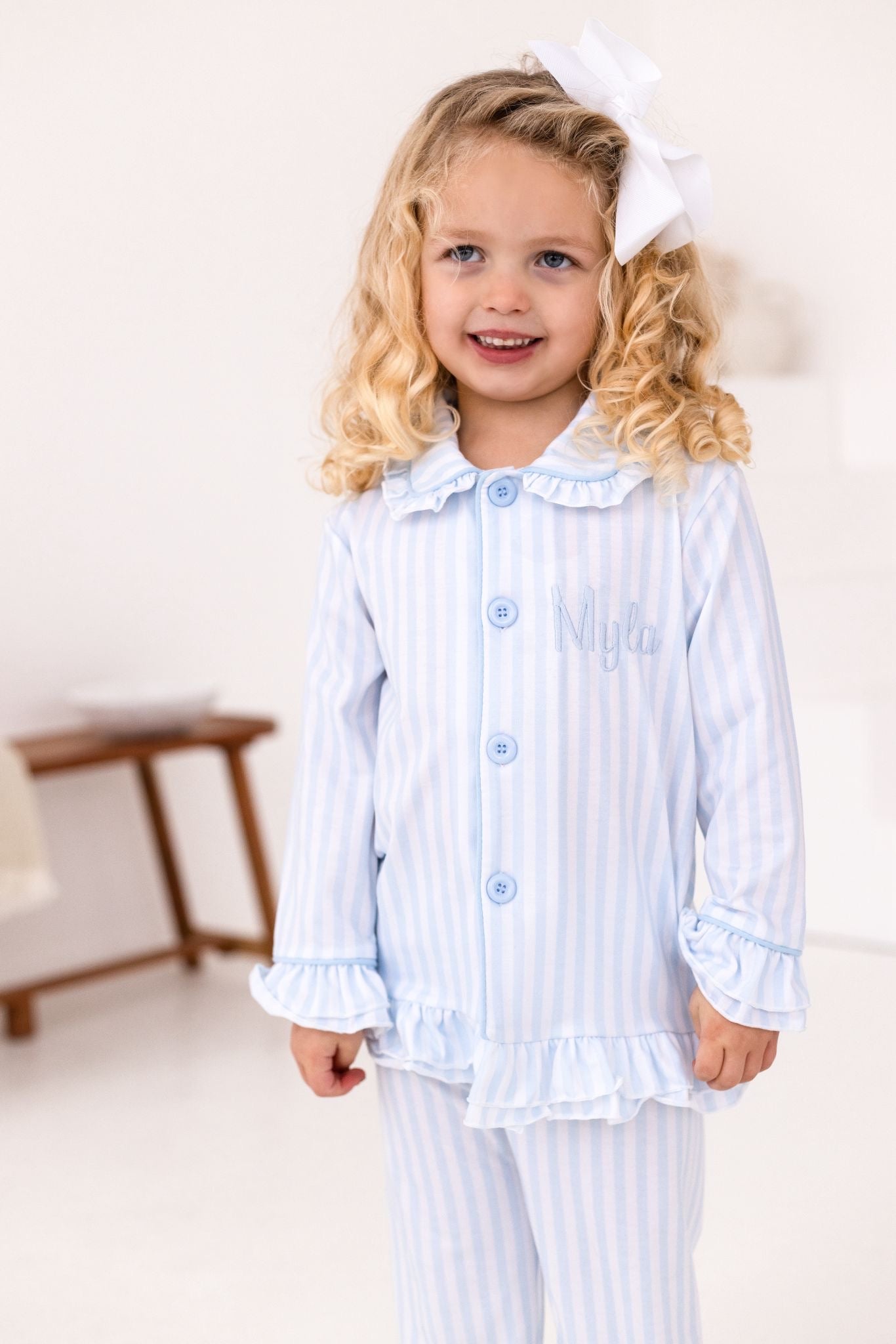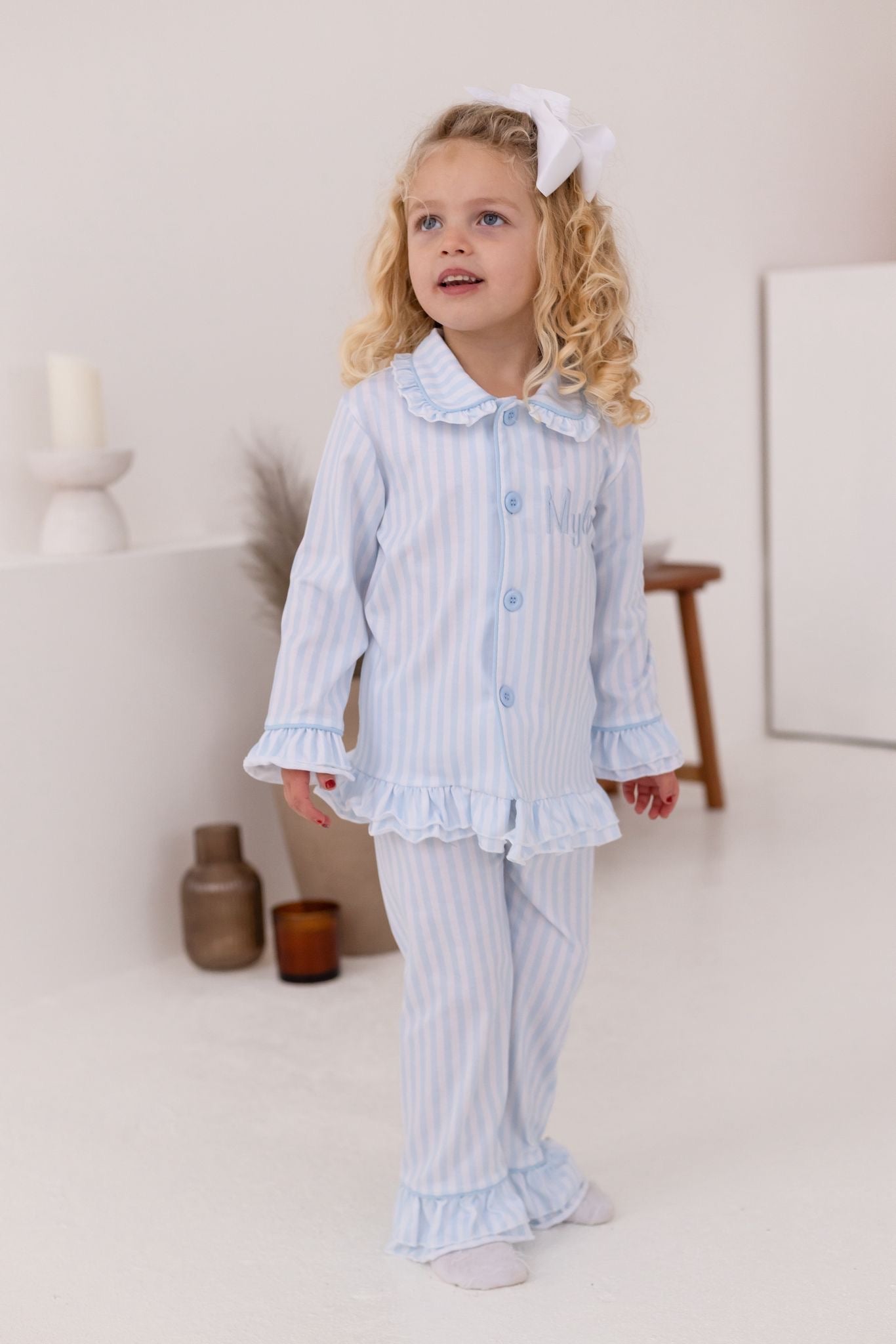 Bring bedtime luxury to your little one with our Stripe Design Pyjamas, created for cosy nights and the prettiest morning photos. Featuring a beautiful Stripe-style print in soft blue tones, a classic button-front top and statement frill cuffs/ankles, these PJs are the perfect blend of timeless and adorable.