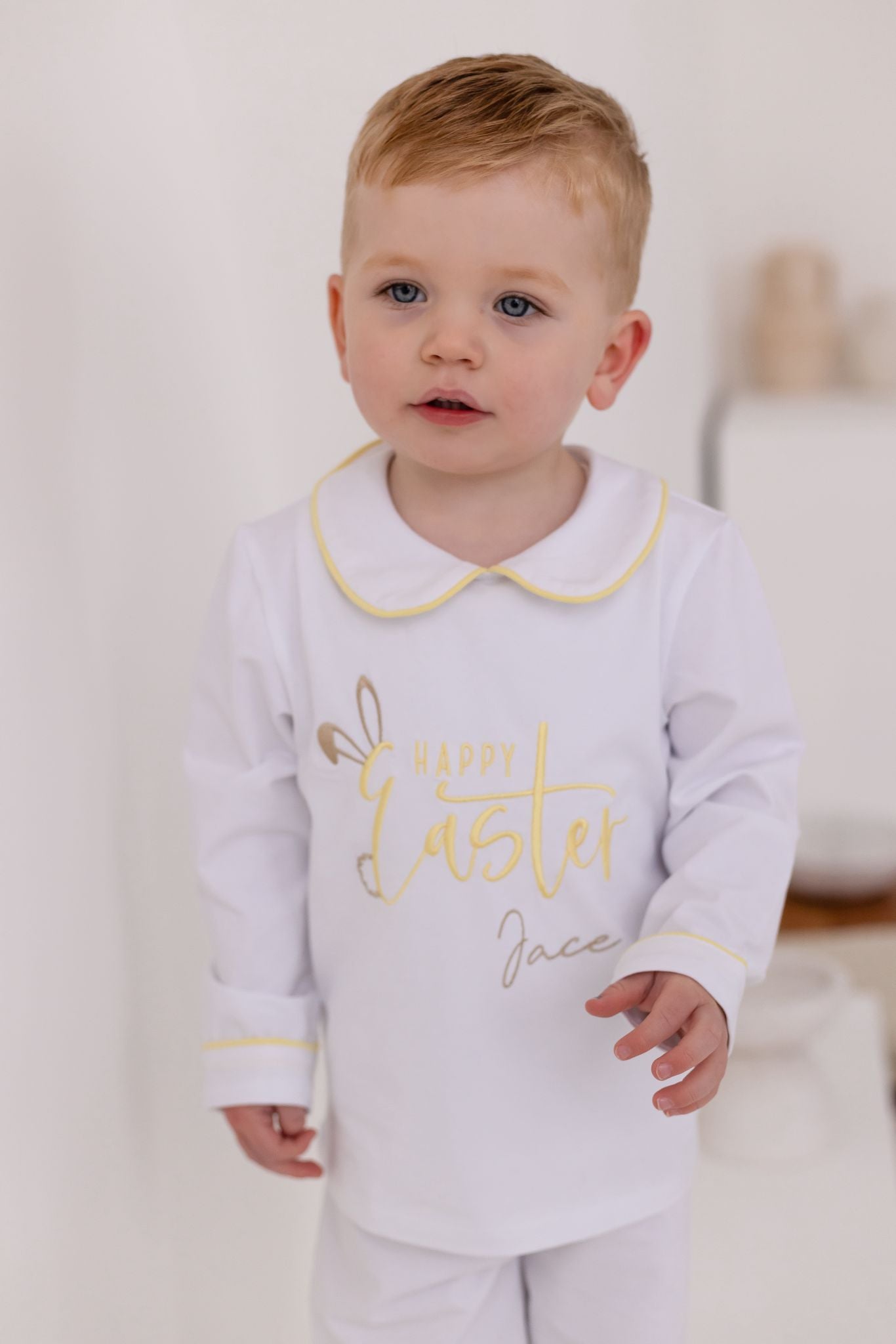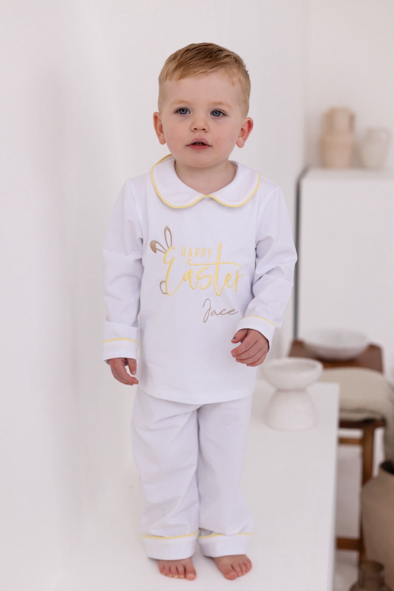 This elegant two-piece pyjama set features a crisp white base with refined pastel lemon piping along the classic Peter Pan collar, cuffs, and ankle hems. Finished with beautiful “Happy Easter” bunny embroidery, delicately personalised with your little one’s name, this set offers a sophisticated yet playful Easter look.