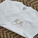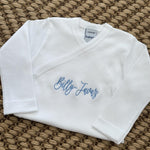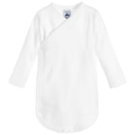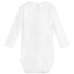White, long-sleeved bodyvest by Babidu, suitable for both baby boys and girls. Made in beautifully soft cotton jersey and edged with a subtle lacy trim. The front crosses over and fastens with poppers, and there are further poppers between the legs for easy changing and dressing.