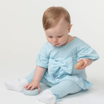 Blue leggings set for baby girls by Caramelo Kids, made in soft cotton jersey. Designed with a pretty frilled hem and sleeves, the top has a decorative bow on the front, trimmed with shimmery sequins. The comfortable leggings have a gently elasticated waistband and little bows on the ankles.