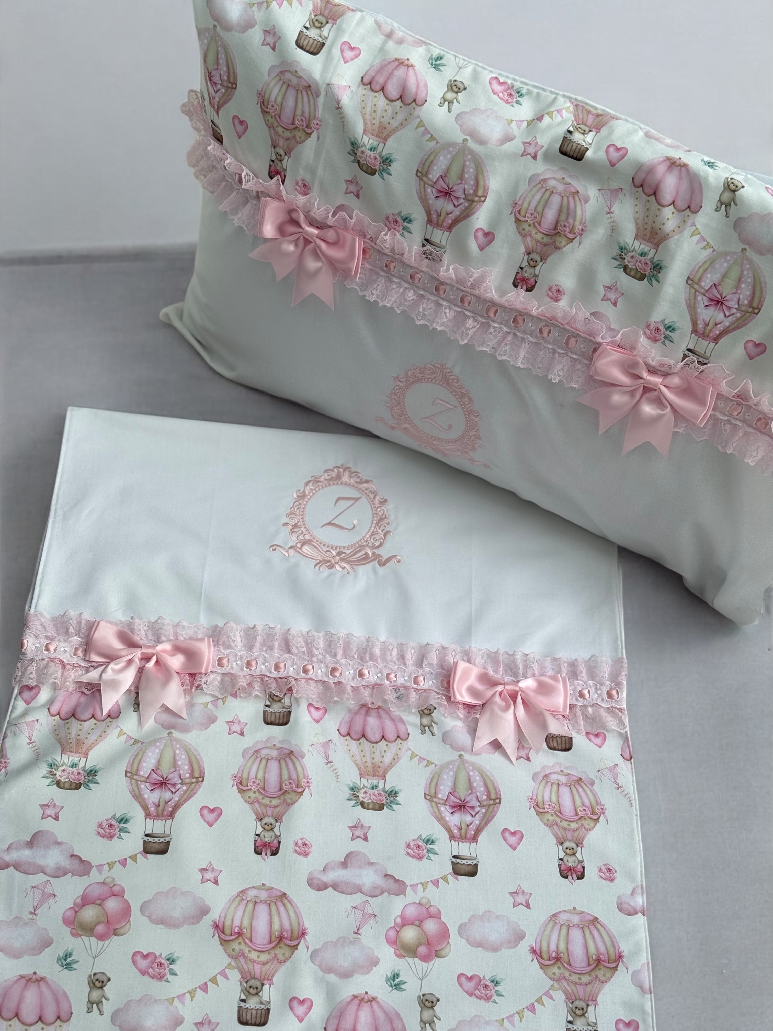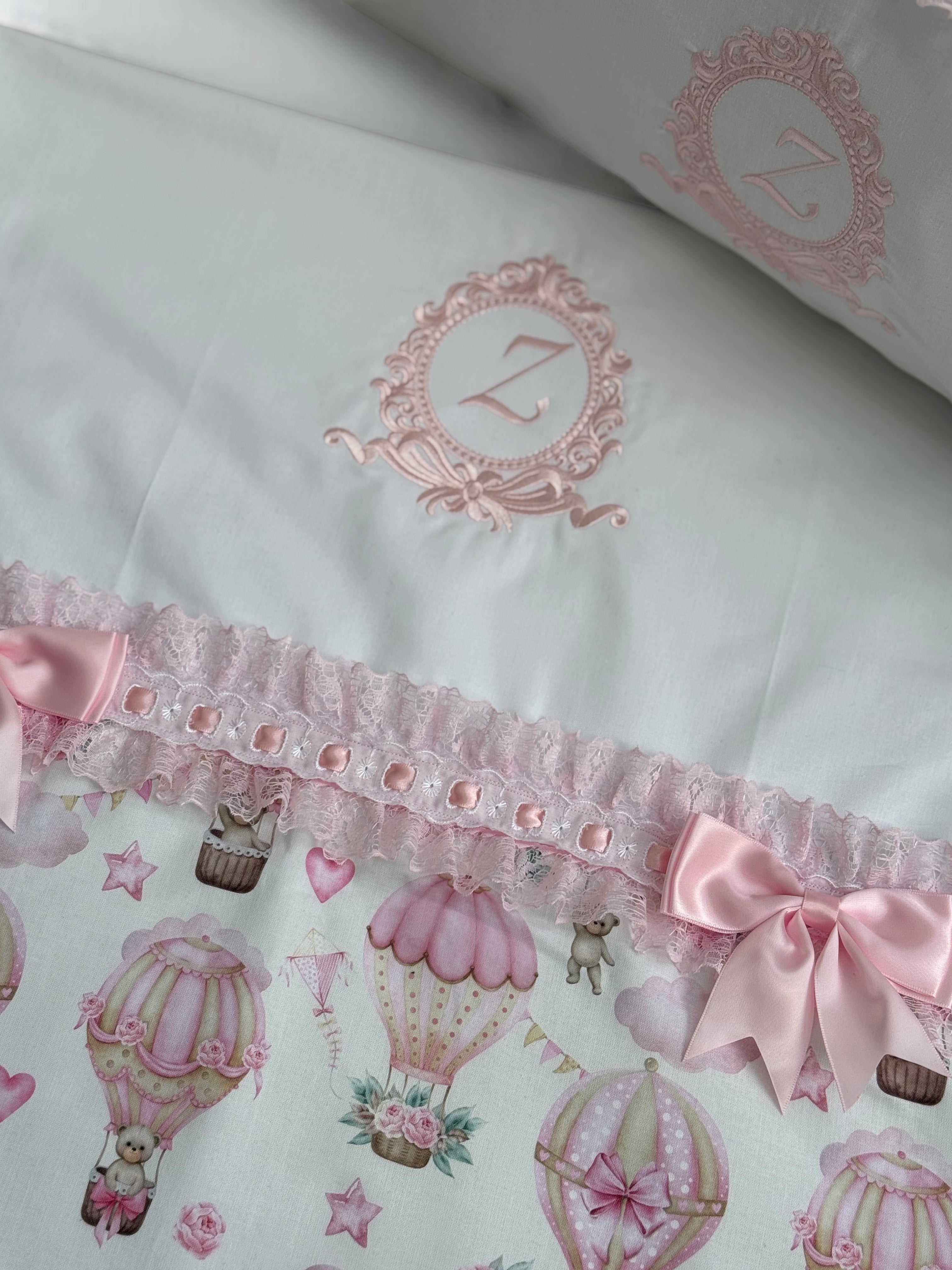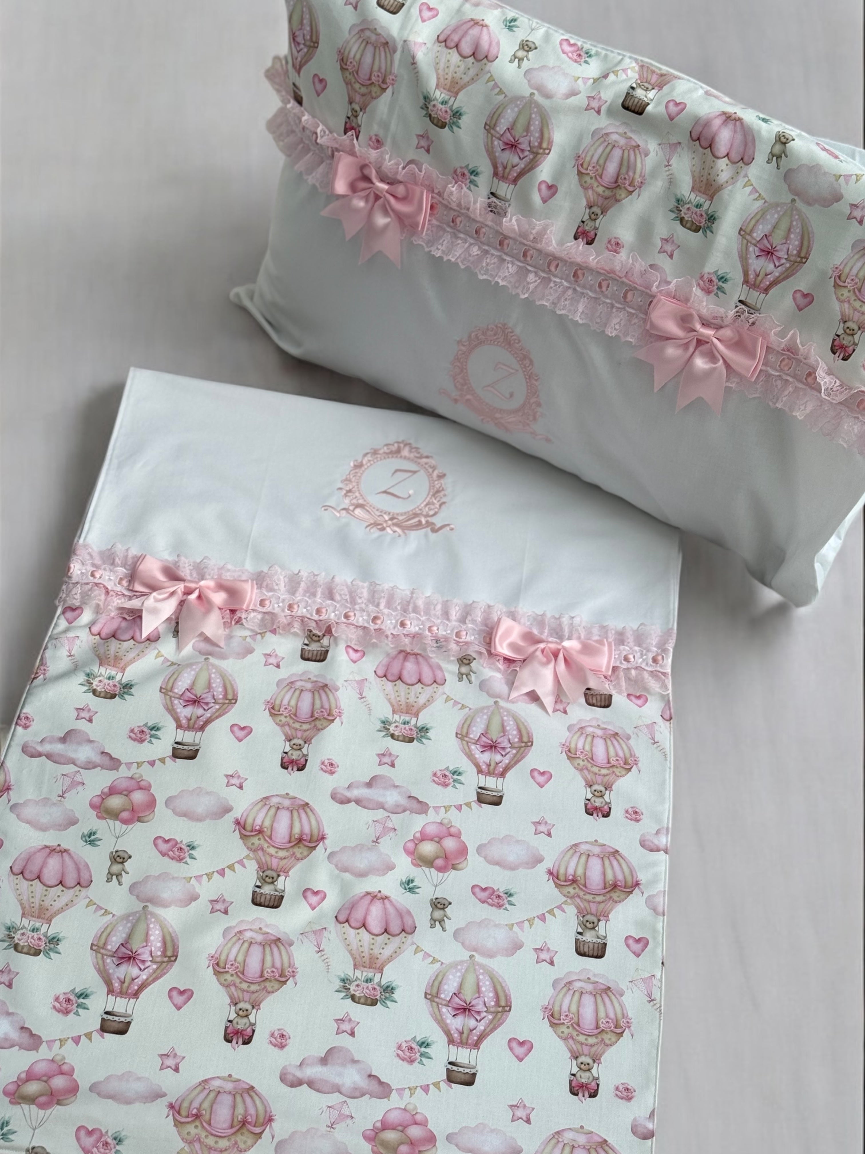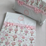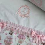 This beautiful handmade baby bedding set features an enchanting hot air balloon design, complemented by delicate frill lace detailing and charming pink bows across the front. The pillow included is a full-size bed pillow, but if you prefer a different size, feel free to email us after placing your order. The bottom sheet also showcases the same hot air balloon design with frill lace trim and bows, specially made for a cot mattress.