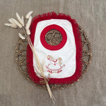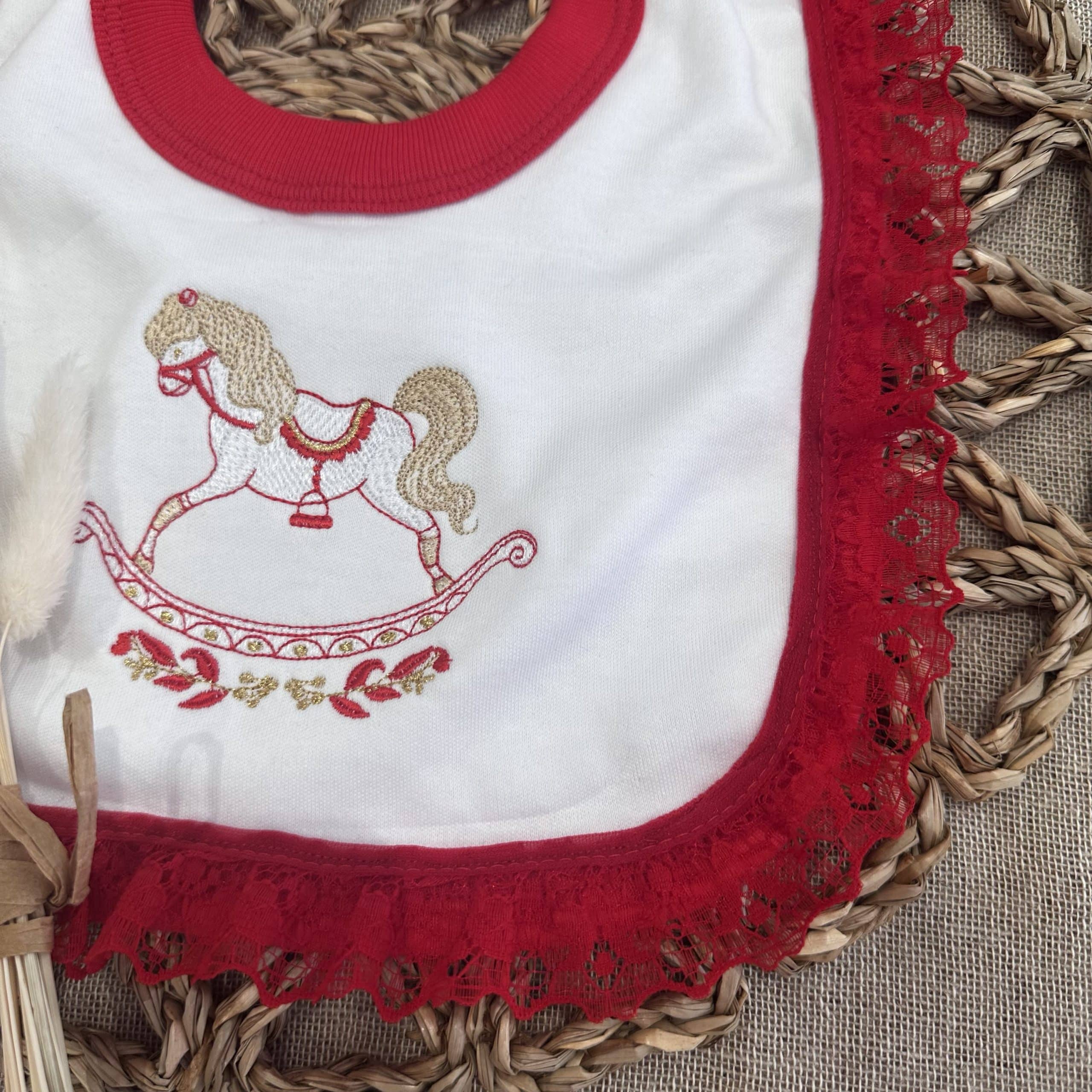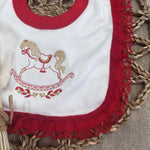Baby girls Embroidered Rocking Horse bib with a beautiful lace trim.