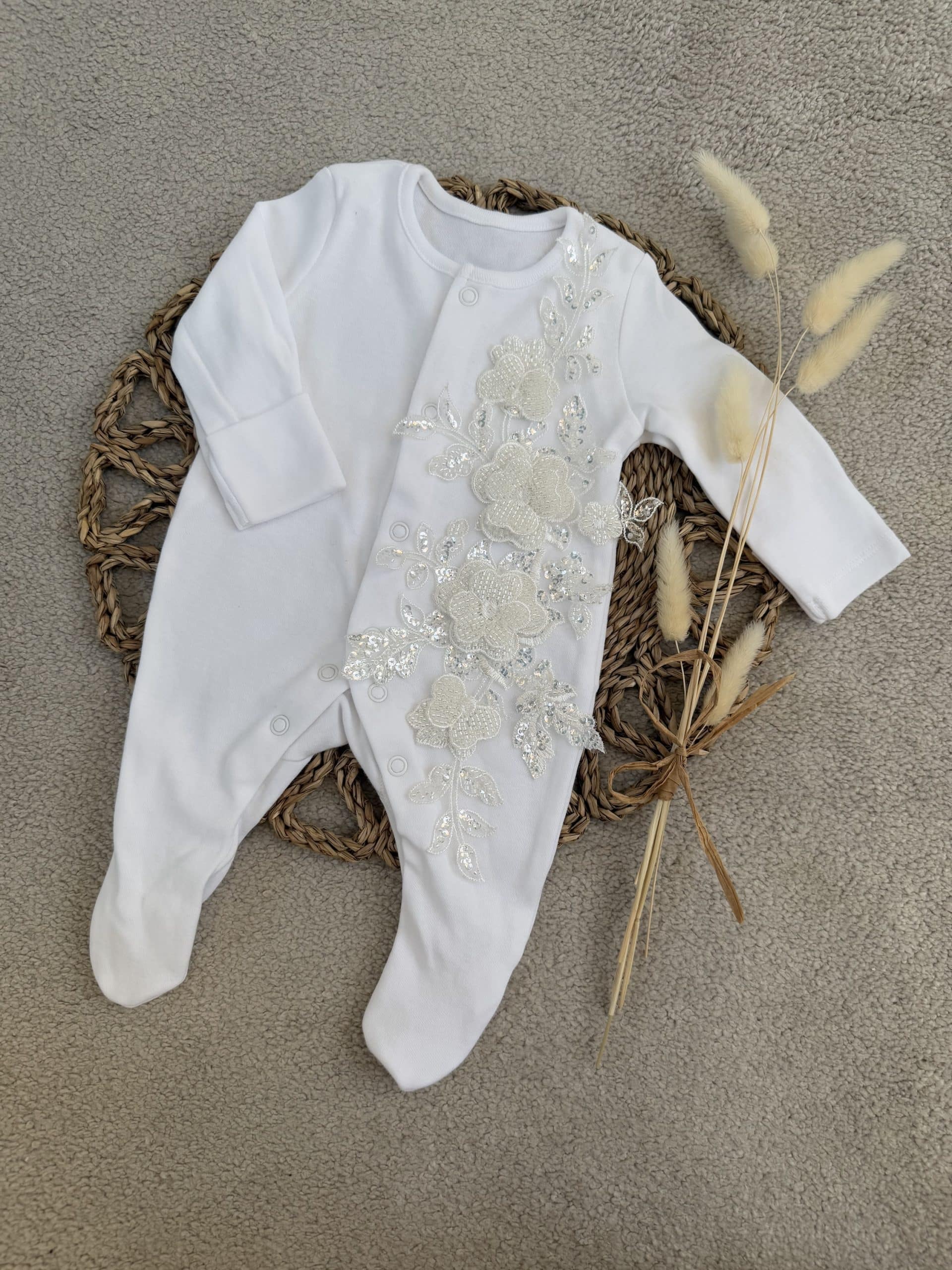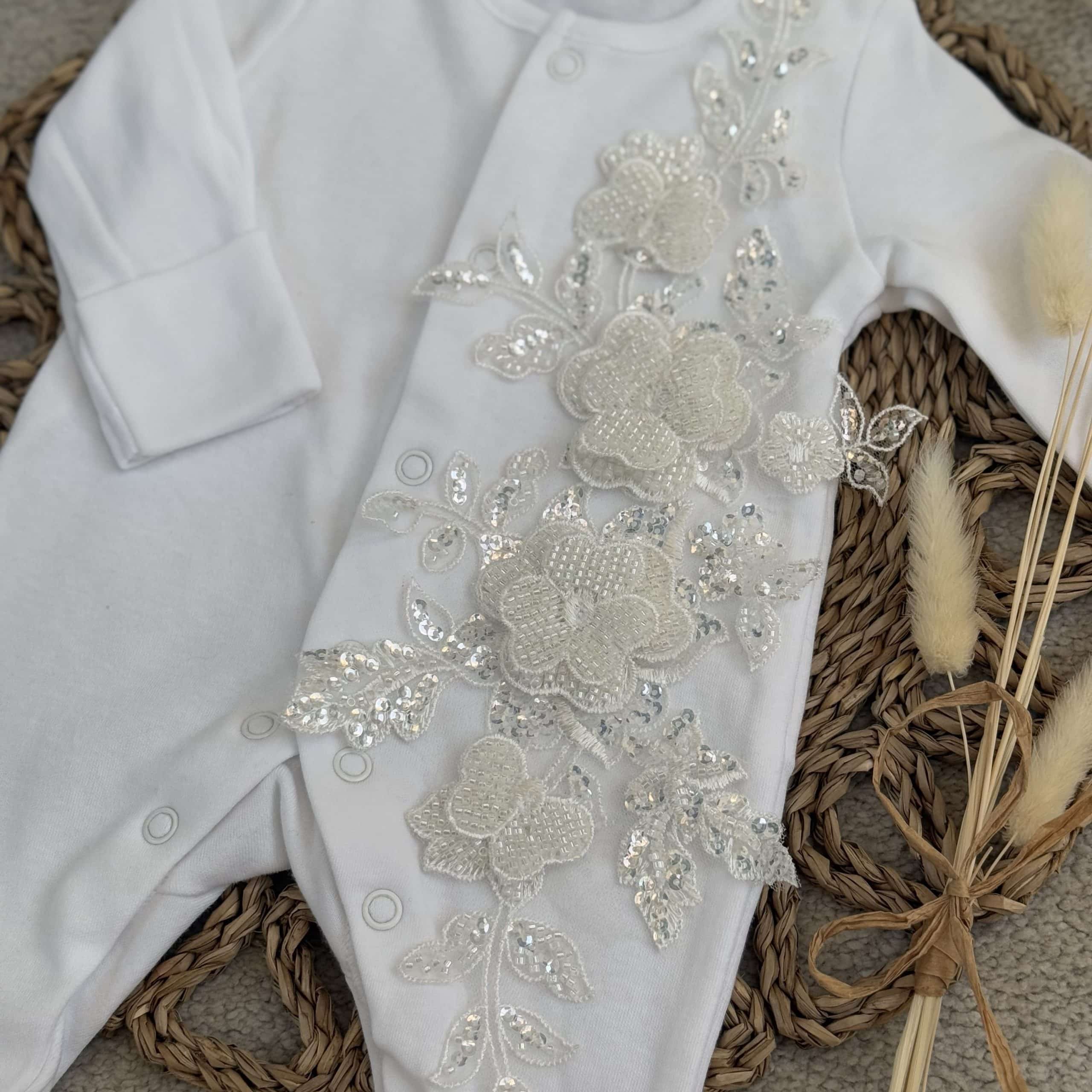 This is a beautiful unique handmade baby grow with 3D sparkle flowers down the front made from 100% polyester you can have this with or with personalisation on the front.