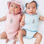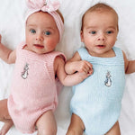 This adorable hand-made knitted romper is the perfect addition to your little one's wardrobe. Crafted from soft double-knit acrylic wool, it ensures warmth and comfort for your baby all day long. The romper features a charming Peter Rabbit embroidery on the front, adding a touch of whimsy and nostalgia to the design. Practical and sweet, the romper includes buttons underneath for easy diaper changes, making it both functional and fashionable. Available in four beautiful colours—pink, blue, beige, and cream—this cosy romper is a must-have for any baby’s wardrobe. Perfect for keeping your little one snug and stylish!