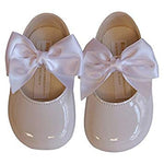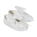 White pre-walker occasion shoes for baby girls from British brand Early Days, made in soft patent faux leather. They have a comfortable textile lining and a lightly cushioned insole, with a soft, flexible outer sole. For a pretty finish, they have a white big satin bow on the button fastening strap.