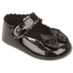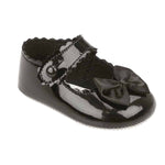 Baby girls Black button bow patent pram shoes also available in Red , Black,White, Ivory & Pink perfect for a parties and special occasions.